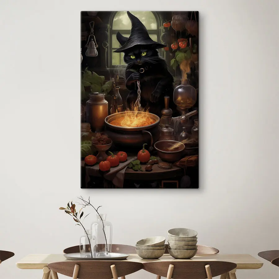 Machen Sie sich bereit, Ihren Raum mit diesem skurrilen Leinwanddruck aufzupeppen, der eine Katze mit einem Zaubererhut zeigt, die in einem mystischen Topf mit blubbernden Leckereien rührt! Es ist wie ein Stück Laune direkt aus einem Märchenbuch. Dieses Kunstwerk ist perfekt für alle, die einzigartige Dekorationen lieben. Es strahlt Wärme und eine Prise Humor aus, so als ob die schelmische Katze Sie einladen würde, beim Kochen mitzumachen. Stellen Sie es sich in einer gemütlichen Küche oder in einer verspielten Ecke vor; es wird mit Sicherheit für Gesprächsstoff sorgen. Ganz gleich, ob Sie ein Katzenliebhaber sind oder einfach nur clevere Kunst zu schätzen wissen, dieses Stück wird Ihnen jedes Mal ein Lächeln entlocken, wenn Sie daran vorbeigehen. Es ist die Art von Charme, die eine gewöhnliche Wand in etwas Magisches verwandelt!