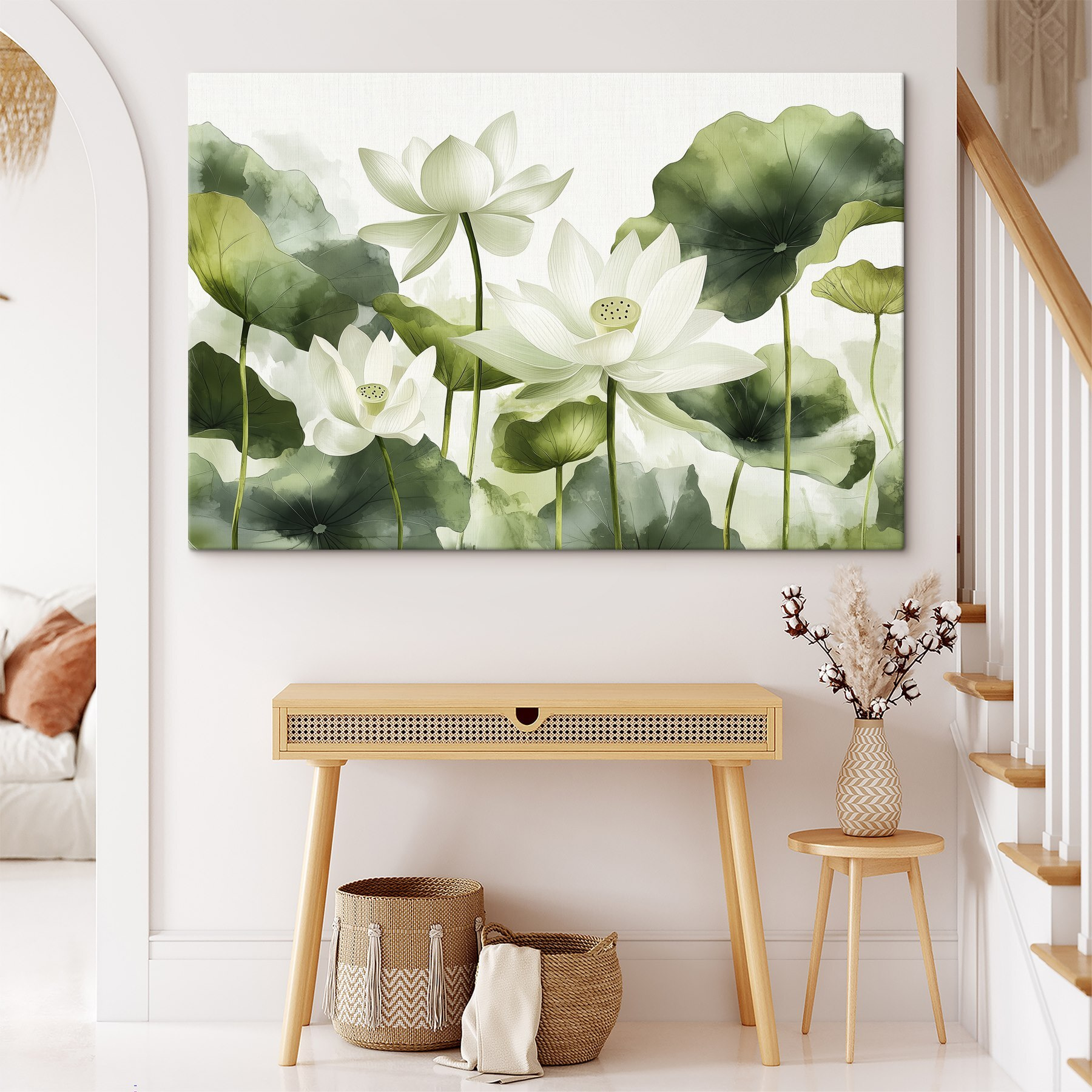 Stellen Sie sich das vor: eine heitere Ansammlung weißer Blüten, die sich mit üppigen grünen Blättern vermischen, alles in verträumten Aquarellfarben gehalten. Jedes Mal, wenn Sie das Bild betrachten, atmen Sie eine frische Morgenbrise ein. Perfekt, um jede kahle Wand in einen ruhigen Rückzugsort zu verwandeln. Nicht nur für botanisch Interessierte, sondern für jeden, der sich nach einem Hauch von natürlicher Eleganz zu Hause sehnt. Unerwarteter Vorteil? Diese Blumen verwelken nie! Stellen Sie sie ins Wohnzimmer oder in eine gemütliche Ecke und lassen Sie sie einfach ihre friedliche Magie wirken. Einfach wunderschön, nicht wahr?
