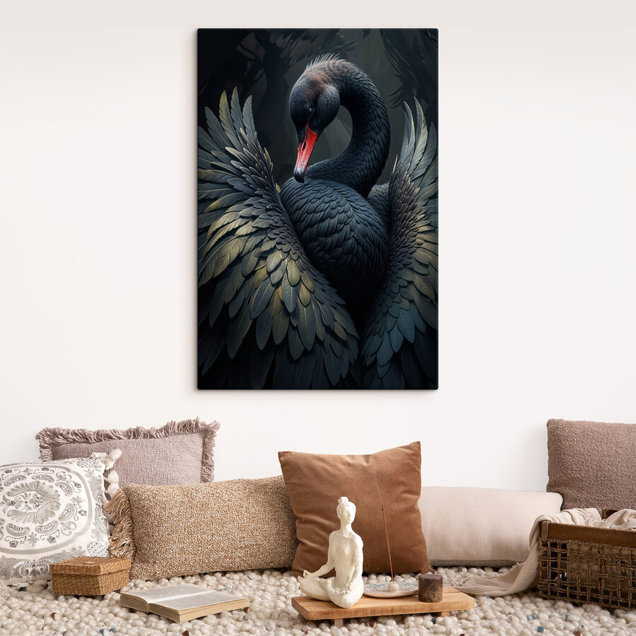 Verwandeln Sie Ihren Raum mit dem atemberaubenden “Wandbilder Black Swan with a Red Beak”. Dieses Stück ist nicht nur eine Dekoration, sondern ein Statement. Stellen Sie sich vor: ein wunderschöner schwarzer Schwan mit einem auffälligen roten Schnabel, der anmutig zwischen Blättern posiert, die lebendig zu werden scheinen. Es ist, als würde er Sie zu einem Gespräch über die Eleganz der Natur einladen.
