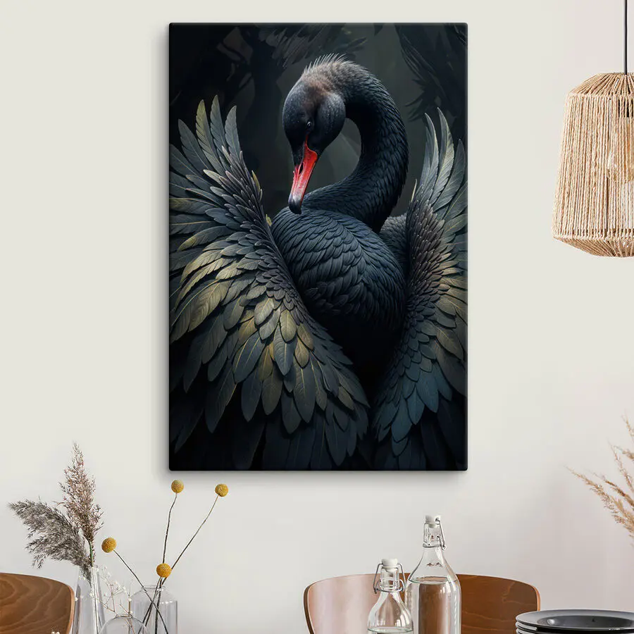 Verwandeln Sie Ihren Raum mit dem atemberaubenden “Wandbilder Black Swan with a Red Beak”. Dieses Stück ist nicht nur eine Dekoration, sondern ein Statement. Stellen Sie sich vor: ein wunderschöner schwarzer Schwan mit einem auffälligen roten Schnabel, der anmutig zwischen Blättern posiert, die lebendig zu werden scheinen. Es ist, als würde er Sie zu einem Gespräch über die Eleganz der Natur einladen.