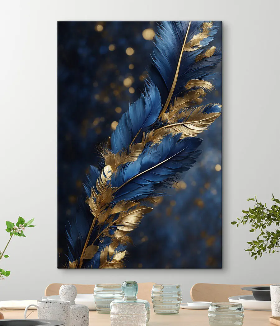 Tauchen Sie ein in die heitere Schönheit dieses Leinwandbildes mit eleganten Federn auf einem satten, dunklen Hintergrund. Es ist, als hätte man ein kleines Stück Natur direkt an der Wand – perfekt für alle, die die Verbindung von Kunst und Natur schätzen. Stellen Sie sich vor, Sie betreten einen Raum und spüren sofort, wie Sie zur Ruhe kommen. Die leuchtenden Blautöne in Kombination mit den üppigen Federn erzeugen ein beeindruckendes Bild, das den Blick auf sich zieht wie ein gemütliches Gespräch beim Kaffee. Es ist nicht nur Dekoration, es ist ein Erlebnis, ein Gesprächsanlass und ein Hauch von Laune in einem. Perfekt, um ein Wohnzimmer, ein Schlafzimmer oder sogar einen kreativen Arbeitsbereich zu verschönern. Sie wissen, dass Sie diese Stimmung wollen! Wer würde sich nicht jeden Tag ein bisschen inspirierter fühlen wollen?