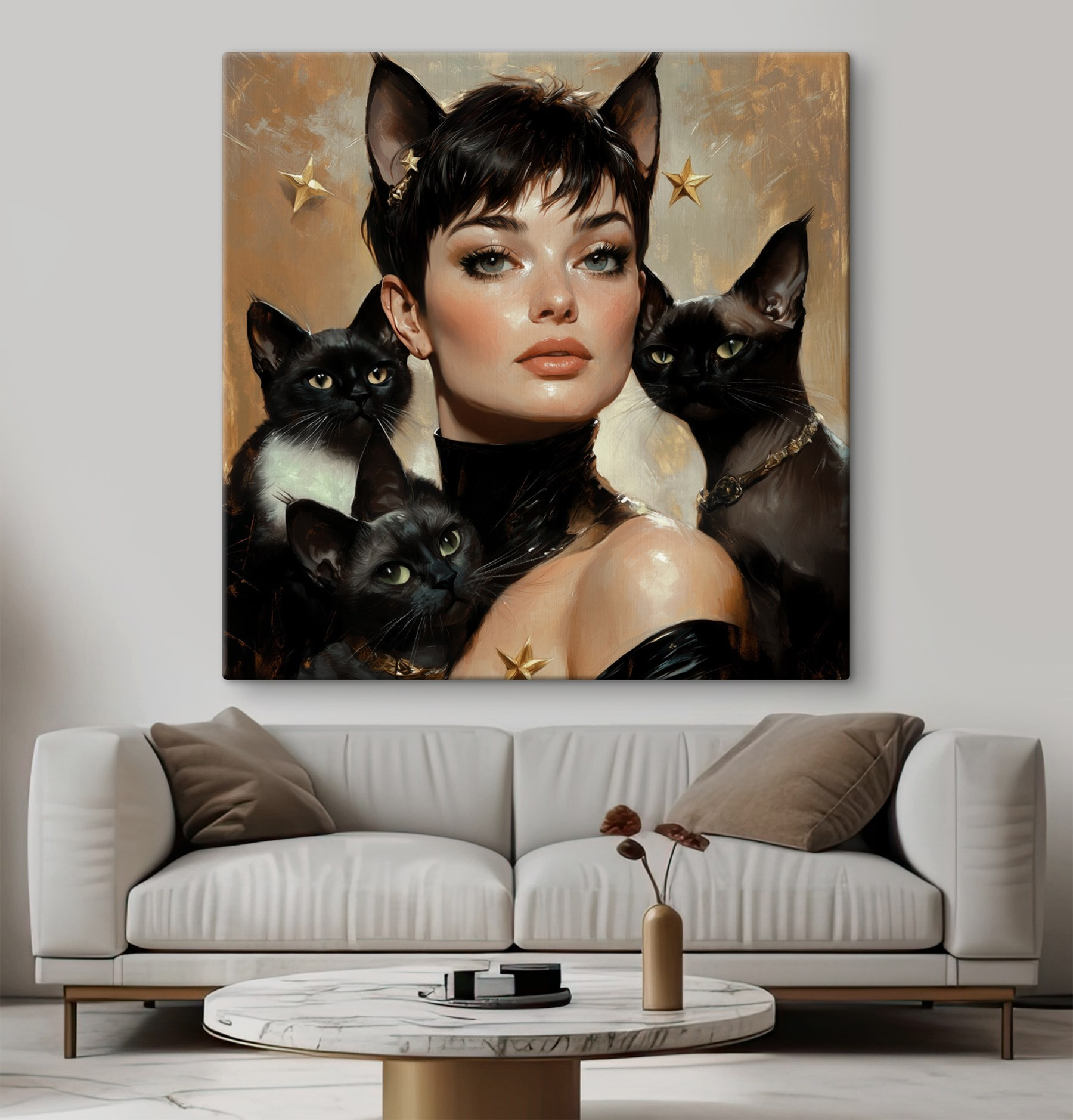 Stellen Sie sich eine Welt vor, in der Katzen das Sagen haben – oder zumindest Ihre Wände! Dieses bezaubernde Leinwandbild “Frau mit Katzen um den Hals” ist perfekt für alle, die ein wenig Skurrilität in ihrer Einrichtung zu schätzen wissen. Stellen Sie sich Folgendes vor: Ihre Gäste kommen herein und bemerken sofort die bezaubernden Augen der Katzen, die es fast wagen, ihre katzenhafte Weisheit in Frage zu stellen. Es ist, als ob jede Katze ein Geheimnis hat, das sie mit Ihnen teilt und Ihnen Geschichten von Abenteuern und gemütlichen Nickerchen zuflüstert. Dieses Stück bringt Wärme, Charme und einen Hauch von Geheimnis in jeden Raum – ein echter Gesprächsanlass mit einer Portion Schnurren.