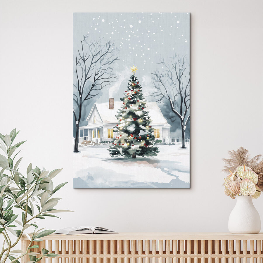 Verwandeln Sie Ihren Raum mit diesem bezaubernden Leinwandbild “Weihnachtsbaum vor einem Haus”. Stellen Sie es sich vor: ein gemütliches, verschneites Haus mit einem leuchtenden Baum unter dem Winterhimmel. Es ist wie eine warme Umarmung für Ihre Wände – perfekt, um das ganze Jahr über einen Hauch von Weihnachtsstimmung zu verbreiten. Stellen Sie sich vor, wie Sie es sich mit einem heißen Kakao gemütlich machen, die Nostalgie dieser festlichen Nächte spüren, das Lachen widerhallt und vielleicht sogar ein Schneemann draußen wartet. Dieser Druck ist nicht nur Dekoration, sondern auch eine Erinnerung an fröhliche Momente, gemütliche Zusammenkünfte und den Zauber, der den Winter ausmacht. Lassen Sie es Ihr Zuhause und Ihr Herz erstrahlen!