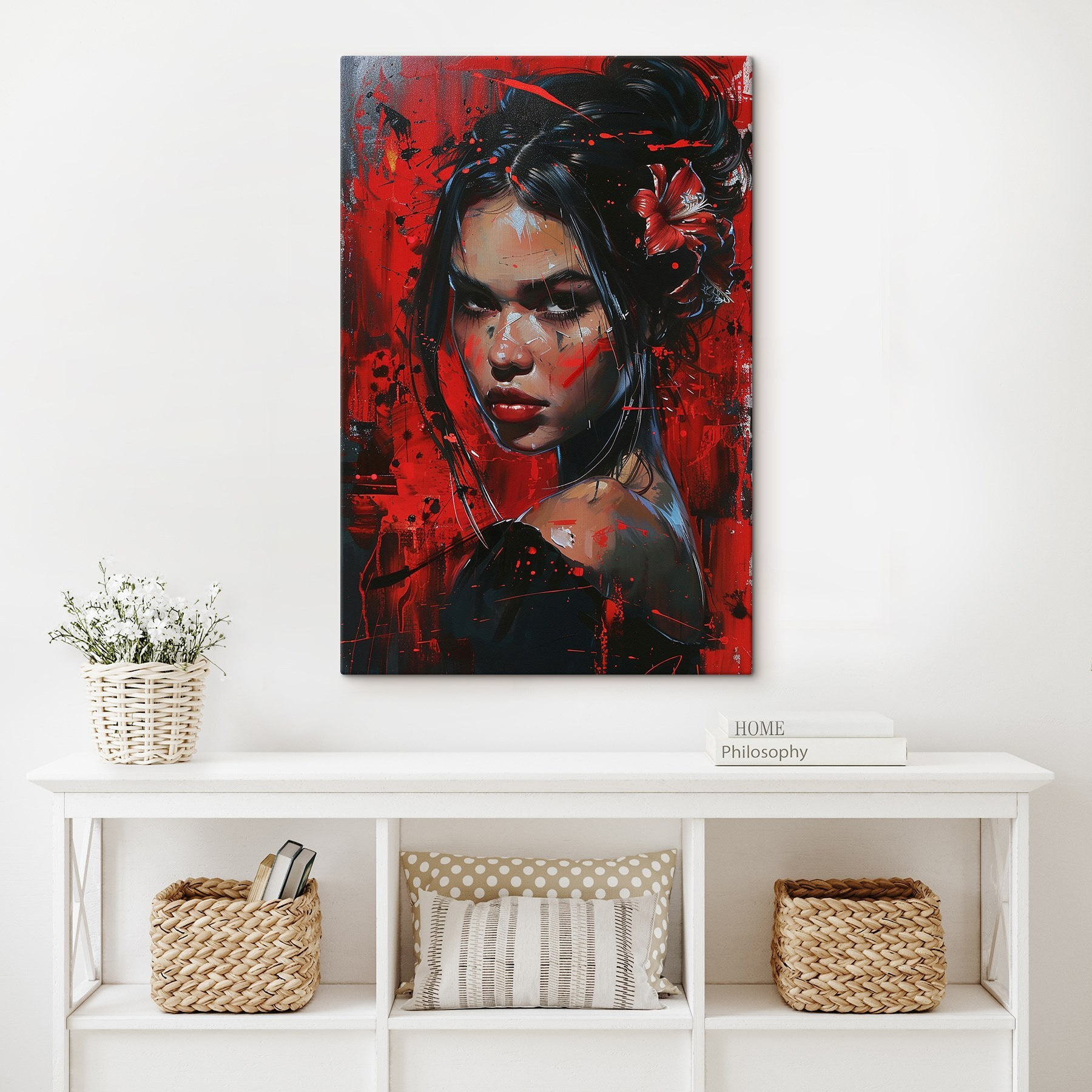 Tauchen Sie ein in die kühne Energie dieses Leinwanddrucks, der eine markante Frau vor einem feurigen Hintergrund aus roter Farbe zeigt. Es ist, als wäre sie direkt dem Traum eines Künstlers entsprungen und strahlt Emotionen und Tiefe aus. Stellen Sie sich dieses Werk in einer gemütlichen Nische vor – es ist die Art von Kunst, die Gespräche anregt, nicht wahr? Die Freunde werden von den leuchtenden Farben und der Geschichte, die sich hinter dem eindringlichen Blick verbirgt, angezogen. Es gibt jedem Raum das Gefühl, lebendig zu sein, als würde er Kreativität atmen. Perfekt, um einem Wohnzimmer oder einem Büro einen Hauch von Persönlichkeit zu verleihen – es ist nicht nur Dekoration, es ist eine Stimmung. Im Ernst: Wer würde seinen Raum nicht gerne mit einer solch wilden Schönheit teilen?