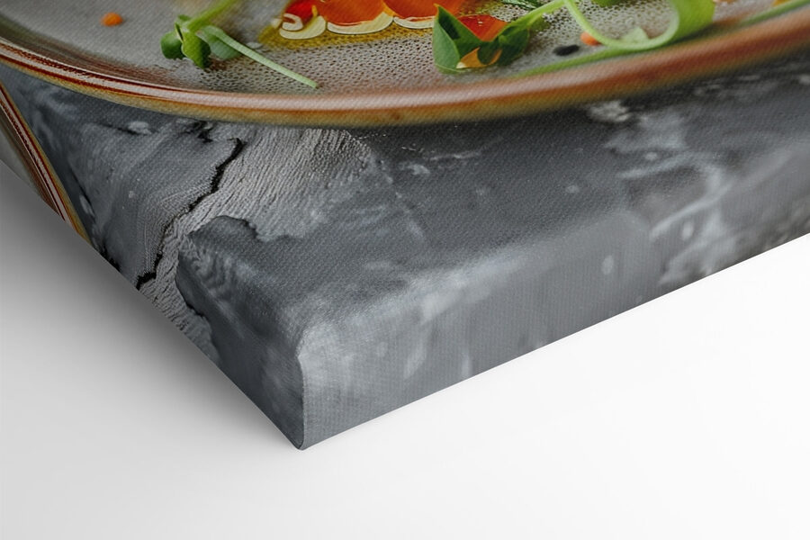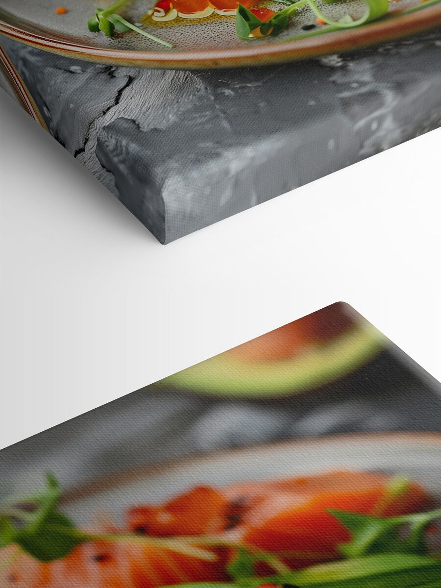 Verwandeln Sie jede Wand in ein kulinarisches Vergnügen mit diesem atemberaubenden Leinwanddruck “Teller mit Essen auf einem Tisch”. Stellen Sie sich vor, Sie betreten Ihre Küche oder Ihren Essbereich, und da ist es – ein köstliches visuelles Festmahl aus frischem Lachs und leuchtender Avocado, kunstvoll arrangiert. Es ist, als ob Ihr Essen Sie anlächelt! Perfekt für Feinschmecker oder alle, die kräftige Farben und schöne Präsentationen zu schätzen wissen. Dieses Stück verleiht einen Hauch von Eleganz und weckt gleichzeitig die Lust auf Leckeres. Es ist nicht nur Dekoration, sondern eine Einladung, jeden Moment zu genießen und vielleicht sogar die eine oder andere Dinnerparty zu inspirieren. Wer möchte nicht diesen köstlichen Geschmacksspritzer an seinen Wänden haben?