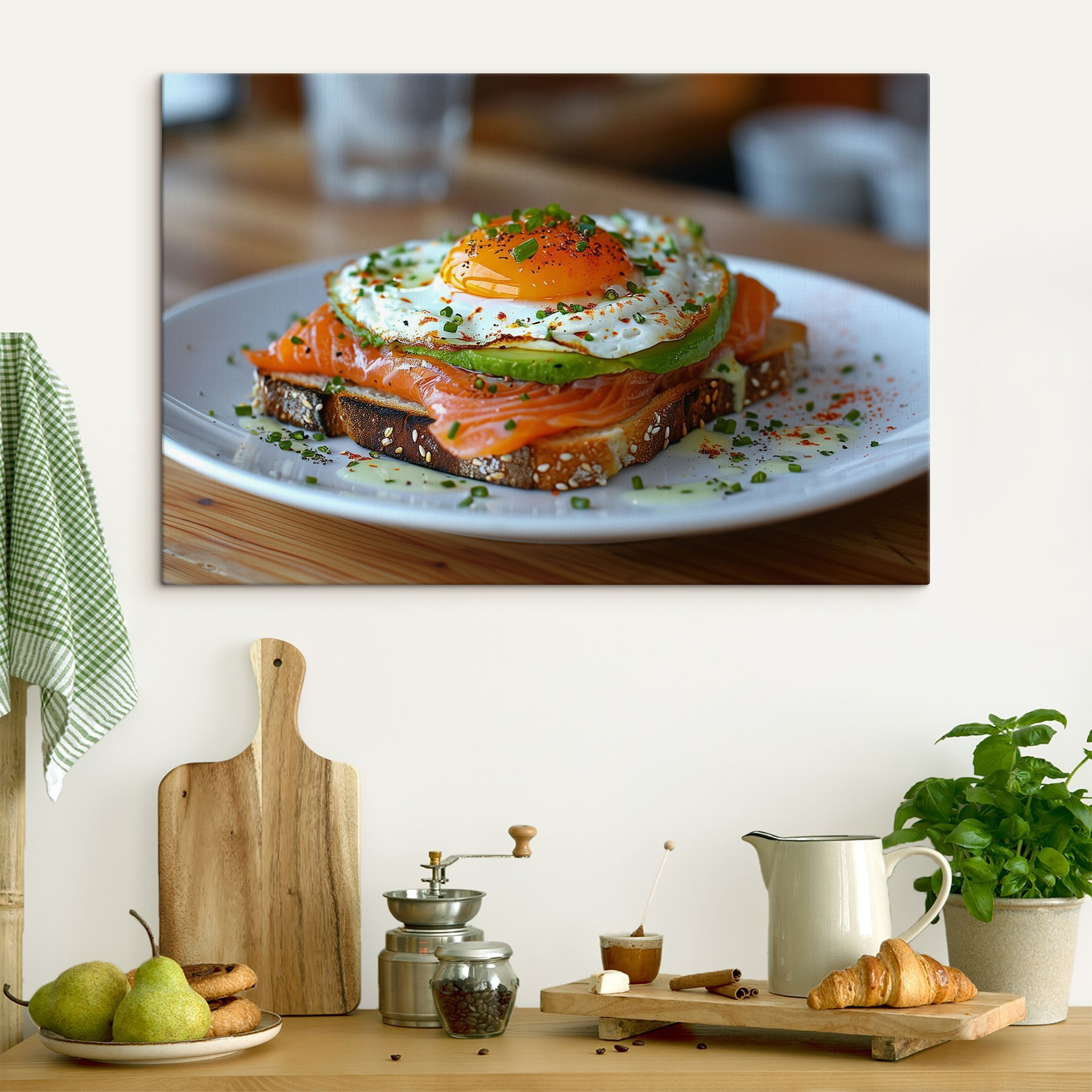 Stellen Sie sich vor, Sie betreten einen Raum, in dem es sofort wärmer und leckerer ist. Dieser Leinwanddruck eines köstlichen Tellers mit einem Spiegelei auf einem Lachs und buntem Gemüse ist genau das. Es ist wie eine Einladung zum täglichen Brunch, ohne dass man eine Schürze oder Geschirr braucht. Die Farben sind knallig und wecken Freude und vielleicht sogar ein wenig Hunger. Stellen Sie es sich in einer gemütlichen Küche oder einem lebhaften Essbereich vor, wo Freunde zusammenkommen und Geschichten erzählt werden. Es ist nicht nur Dekoration, sondern ein Stück Leben, das die Sinne kitzelt und jeder Wand einen verspielten Touch verleiht. Es ist eine Augenweide und ein Gesprächsanlass – wer liebt nicht einen guten Teller Kunst?