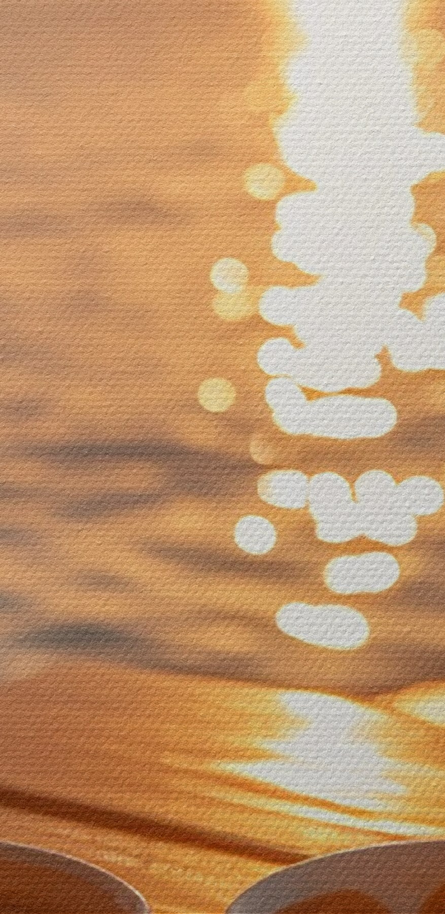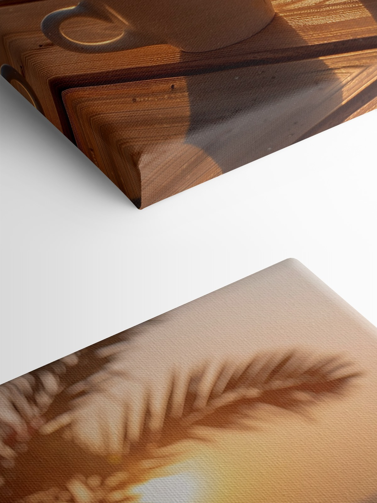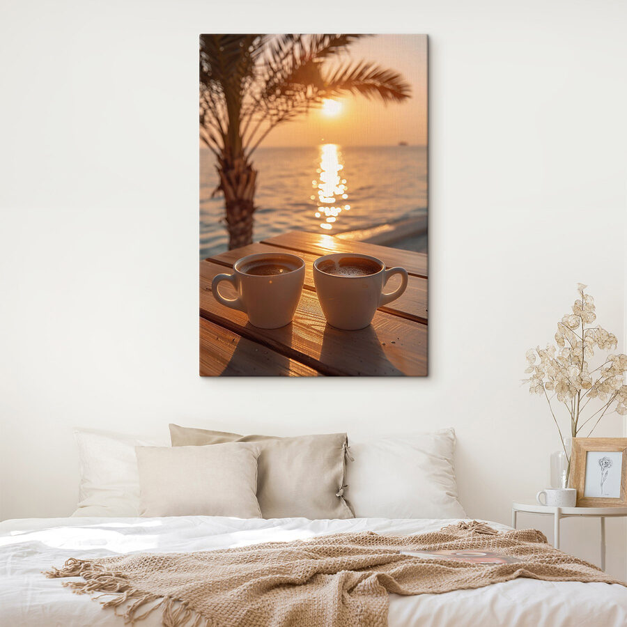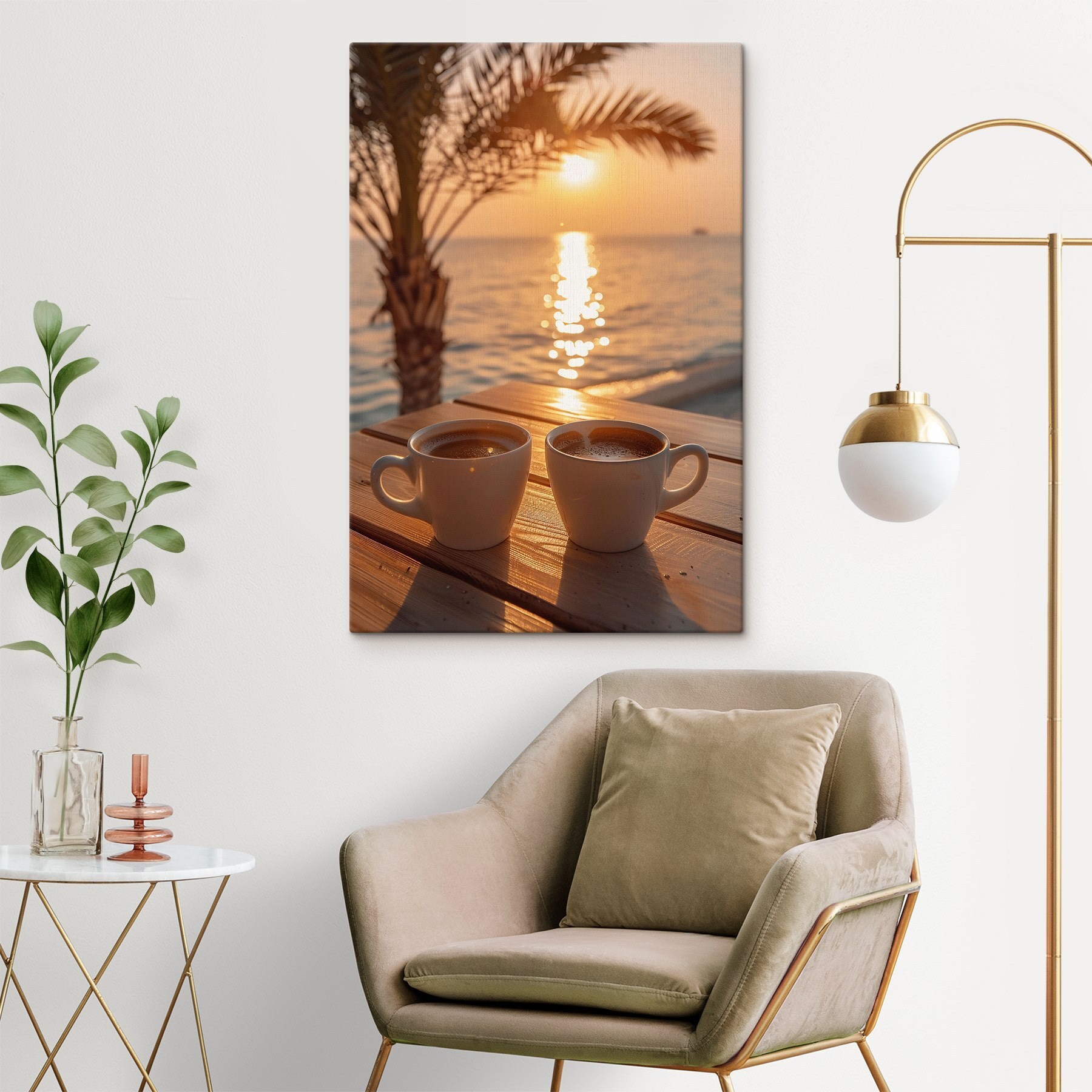 Stellen Sie sich vor, Sie wachen mit dem sanften Schein des Sonnenaufgangs auf, der sich über dem Meer spiegelt, und zwei dampfende Tassen Kaffee warten nur darauf, genossen zu werden. Dieser Leinwanddruck fängt diesen perfekten Moment der Ruhe ein, in dem die Zeit stehen zu bleiben scheint. Es ist, als hätte man einen Mini-Urlaub direkt an der Wand, der zu gemütlichen Gesprächen oder beruhigenden Morgenritualen einlädt. Die sanften Spiegelungen auf dem Wasser sorgen für eine verträumte Atmosphäre, die jeden Raum gemütlich und einladend erscheinen lässt. Perfekt für Kaffeeliebhaber oder alle, die sich einen ruhigen Touch für ihr Zuhause wünschen. Wer würde nicht gerne noch ein wenig länger in dieser Szene verweilen?