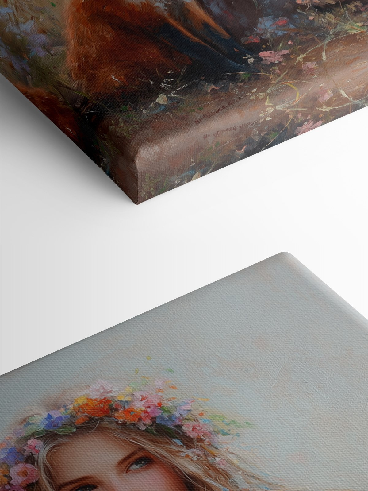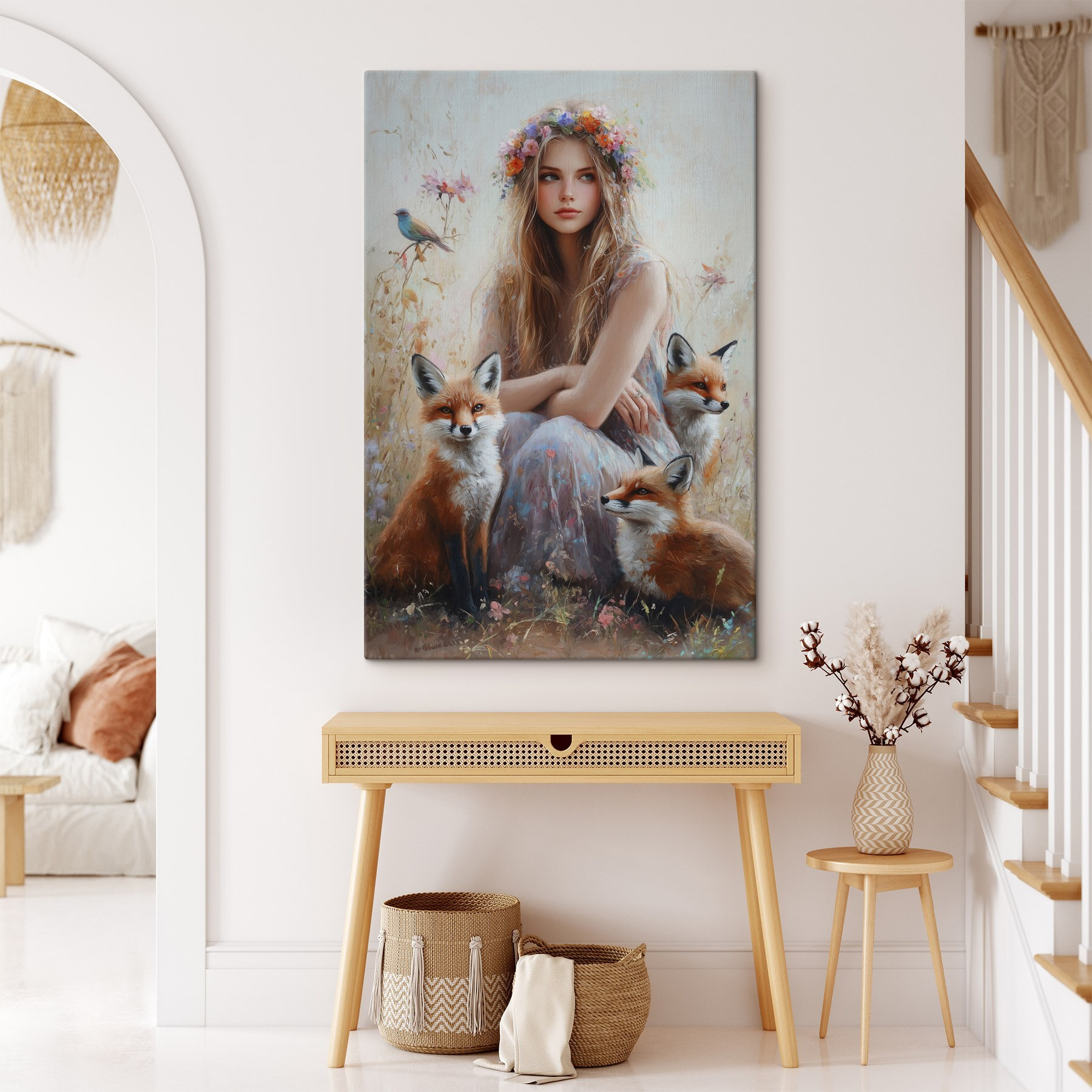 Tauchen Sie mit diesem atemberaubenden Leinwandbild in eine skurrile Welt ein. Es zeigt eine heitere Frau, die von der Natur umarmt wird, und charmante Füchse. Die sanften Pastelltöne und leuchtenden Blumen bilden einen verträumten Hintergrund, der sich wie eine sanfte Umarmung für Ihre Wände anfühlt. Stellen Sie sich dieses Bild in einer gemütlichen Leseecke oder einem hellen Flur vor, das den Raum sofort aufhellt. Es ist, als würde man ein Stückchen Märchenzauber in sein Zuhause holen. Und wer würde sich nicht wünschen, dass ein Trio niedlicher Füchse ihm Gesellschaft leistet? Sie strahlen geradezu Wärme und Neugierde aus. Perfekt für alle, die die Schönheit der Natur und einen Hauch von Laune zu schätzen wissen!