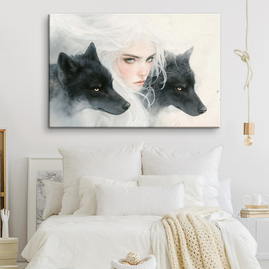 Dieser faszinierende Leinwanddruck zeigt eine auffällige Frau mit wallendem weißen Haar und zwei wilde Wölfe an ihrer Seite. Es fängt eine mystische Stimmung ein und ist perfekt für alle, die einzigartige Dekorationen lieben. Stellen Sie sich vor, dieses Bild in einer gemütlichen Leseecke oder einem lebhaften Wohnzimmer aufzuhängen – es wird garantiert für Gesprächsstoff sorgen! Die Details sind atemberaubend, und der wachsame Blick der Wölfe verleiht dem Ganzen noch mehr Faszination. Es ist, als ob man sich einen Hauch von Wildnis ins Haus holt, eine Erinnerung an Stärke und Schönheit. Perfekt für alle, die Kunst schätzen, die eine Geschichte erzählt, ohne ein Wort zu sagen. Ein Blick genügt und Sie werden in eine Welt voller Abenteuer entführt!