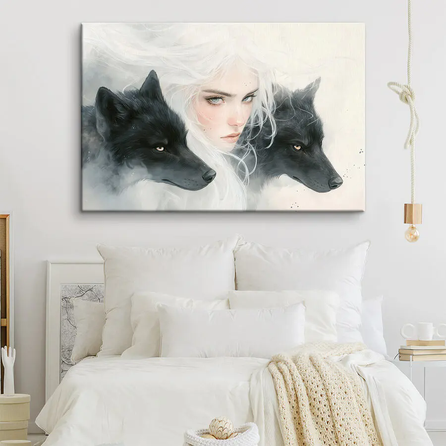 Dieser faszinierende Leinwanddruck zeigt eine auffällige Frau mit wallendem weißen Haar und zwei wilde Wölfe an ihrer Seite. Es fängt eine mystische Stimmung ein und ist perfekt für alle, die einzigartige Dekorationen lieben. Stellen Sie sich vor, dieses Bild in einer gemütlichen Leseecke oder einem lebhaften Wohnzimmer aufzuhängen – es wird garantiert für Gesprächsstoff sorgen! Die Details sind atemberaubend, und der wachsame Blick der Wölfe verleiht dem Ganzen noch mehr Faszination. Es ist, als ob man sich einen Hauch von Wildnis ins Haus holt, eine Erinnerung an Stärke und Schönheit. Perfekt für alle, die Kunst schätzen, die eine Geschichte erzählt, ohne ein Wort zu sagen. Ein Blick genügt und Sie werden in eine Welt voller Abenteuer entführt!