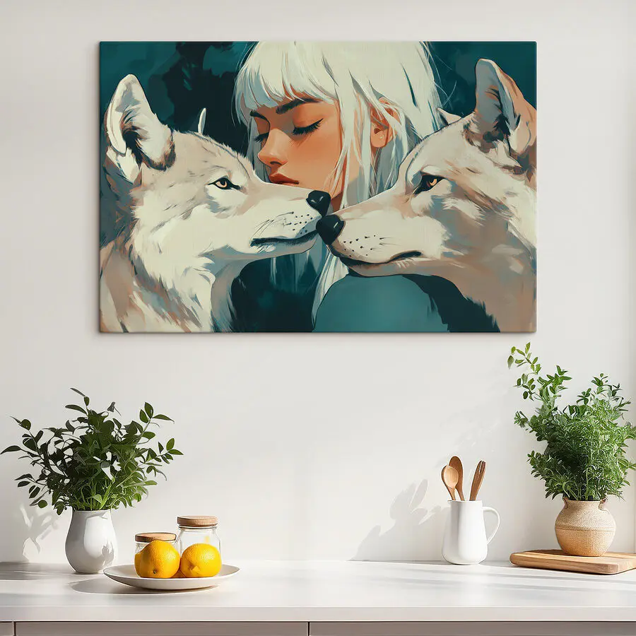 Treten Sie ein in die Welt der wilden Schönheit mit diesem atemberaubenden Leinwandbild, das eine bezaubernde Frau mit wallendem weißen Haar und zwei auffällige Wölfe zeigt. Es ist wie eine Szene direkt aus einem Märchen, nicht wahr? Der zärtliche Blick, den die beiden sich zuwerfen, wirkt fast magisch und lädt Sie in ihre geheime Welt ein. Stellen Sie sich vor, dieses Werk in Ihrem Wohnzimmer oder Ihrer gemütlichen Höhle aufzuhängen – Ihre Freunde werden es bestimmt bewundern. Dieses Kunstwerk dekoriert nicht nur, es regt die Fantasie an und weckt den Geschichtenerzähler in jedem. Lassen Sie sich von der bezaubernden Energie der Wildnis zu unzähligen Gesprächen und Tagträumen inspirieren. Es ist mehr als nur ein Druck, es ist ein Gefühl, das Geschichten von Abenteuer und Verbundenheit flüstert. Perfekt für alle, die die Schönheit der Natur und die Verbundenheit zwischen Mensch und Tier zu schätzen wissen. Nur zu, lassen Sie Ihre Wände eine Geschichte erzählen!
