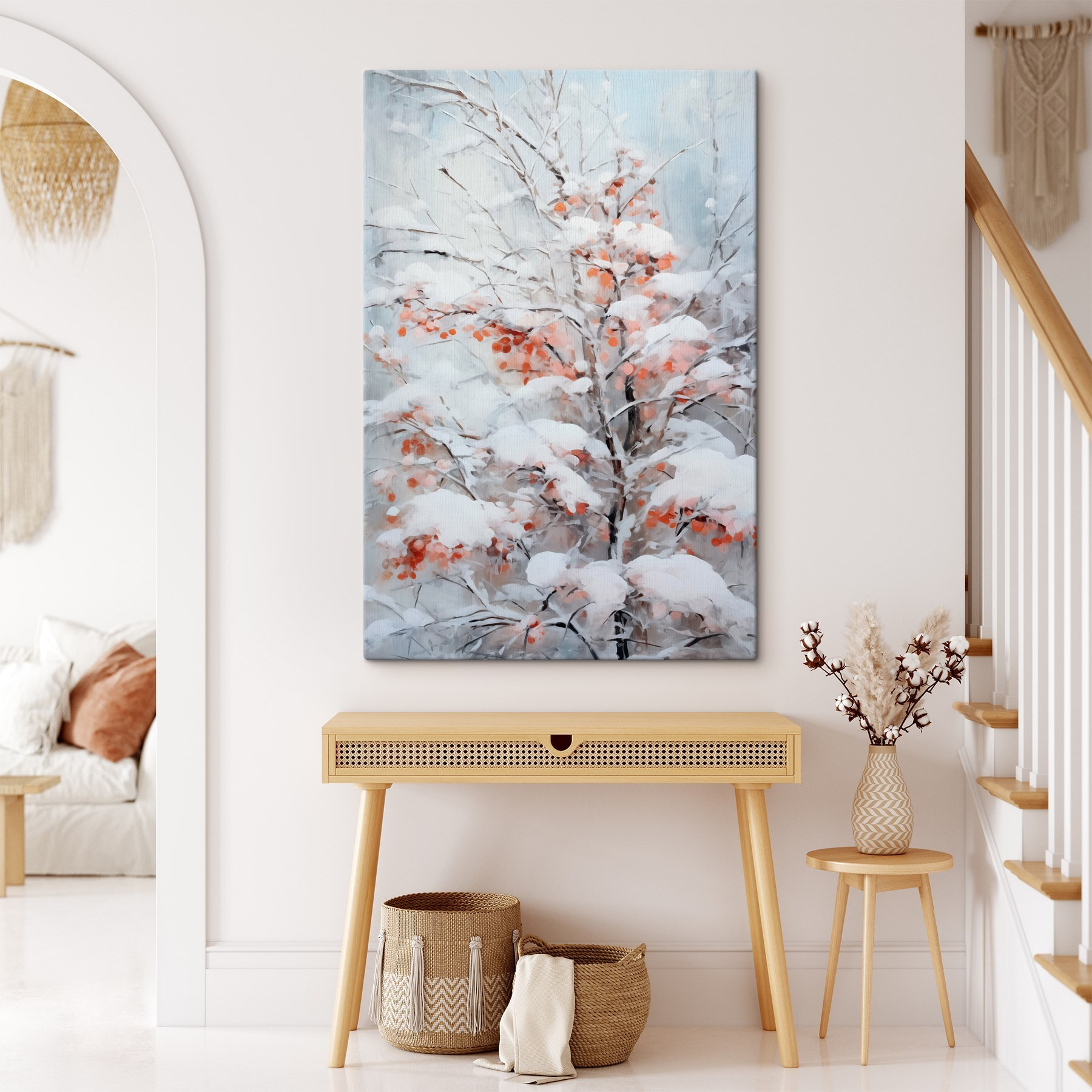 Verwandeln Sie Ihren Raum mit diesem atemberaubenden “Leinwanddruck Baum im Schnee”. Stellen Sie sich vor, Sie machen es sich mit einem warmen Getränk gemütlich, umgeben von der ruhigen Schönheit einer Winterlandschaft direkt an Ihrer Wand. Das weiche Weiß und die dezenten Orangetöne erinnern an die sanfte Ruhe verschneiter Tage und lassen jeden Blick wie einen Hauch von frischer Luft erscheinen. Es ist, als hätte der Baum Ihnen ein kleines Stückchen Kunst der Natur geschenkt – perfekt für ein Wohnzimmer oder sogar eine gemütliche Leseecke. Wer würde sich nicht gerne an verschneite Tage, heißen Kakao und friedliche Momente in einer Decke eingewickelt erinnern lassen? Fügen Sie diese Leinwand hinzu, und lassen Sie Ihre Wände eine Geschichte über den Charme des Winters erzählen.