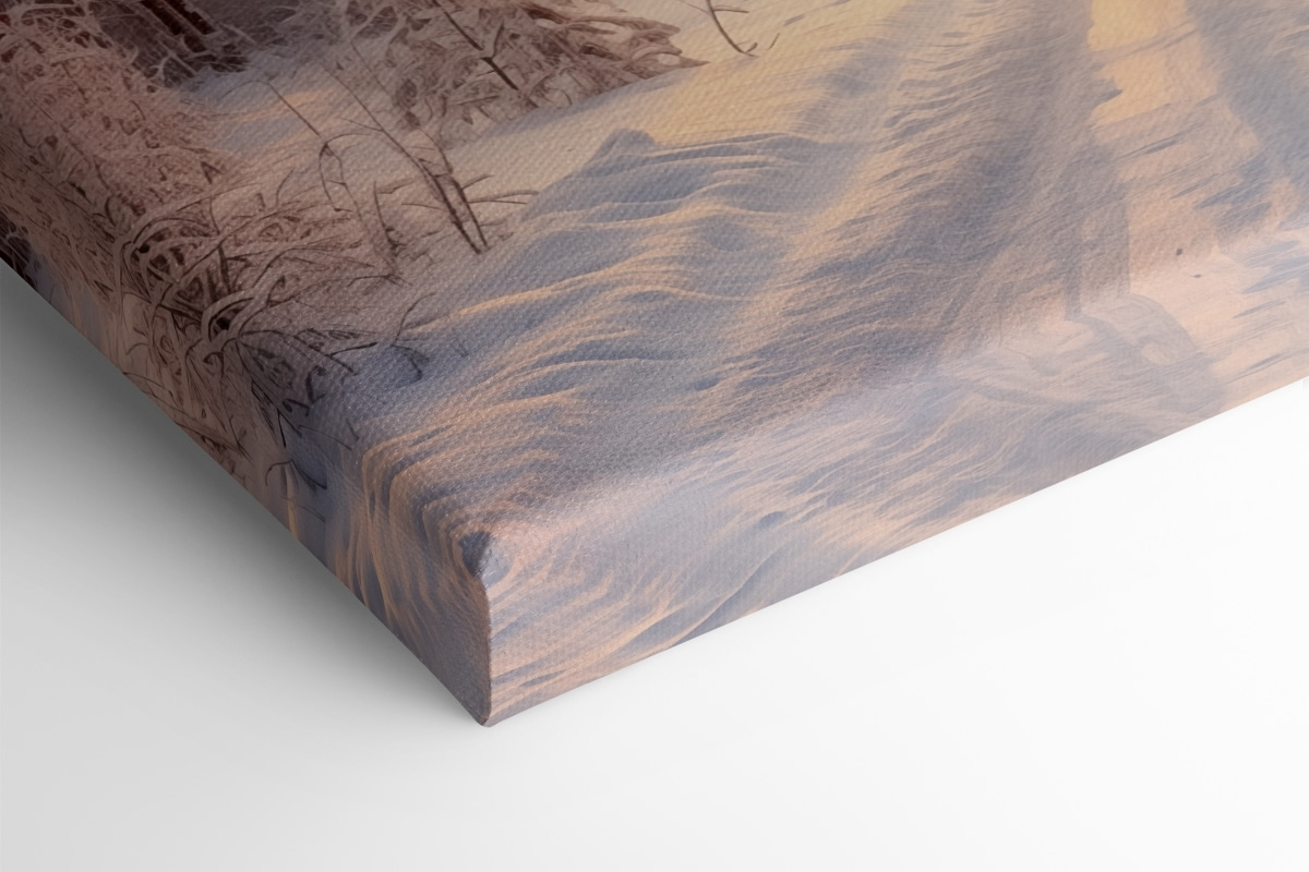 Verwandeln Sie Ihren Raum mit diesem atemberaubenden Leinwanddruck “Snow Covered Road in a Forest”. Stellen Sie sich vor: ein friedlicher, gewundener Weg, bedeckt mit frischem Schnee, umgeben von hohen, eleganten Bäumen. Das sanfte Glühen des Sonnenuntergangs taucht den Himmel in faszinierende Farben – wer hätte gedacht, dass ein Winterwunderland so warm sein kann?