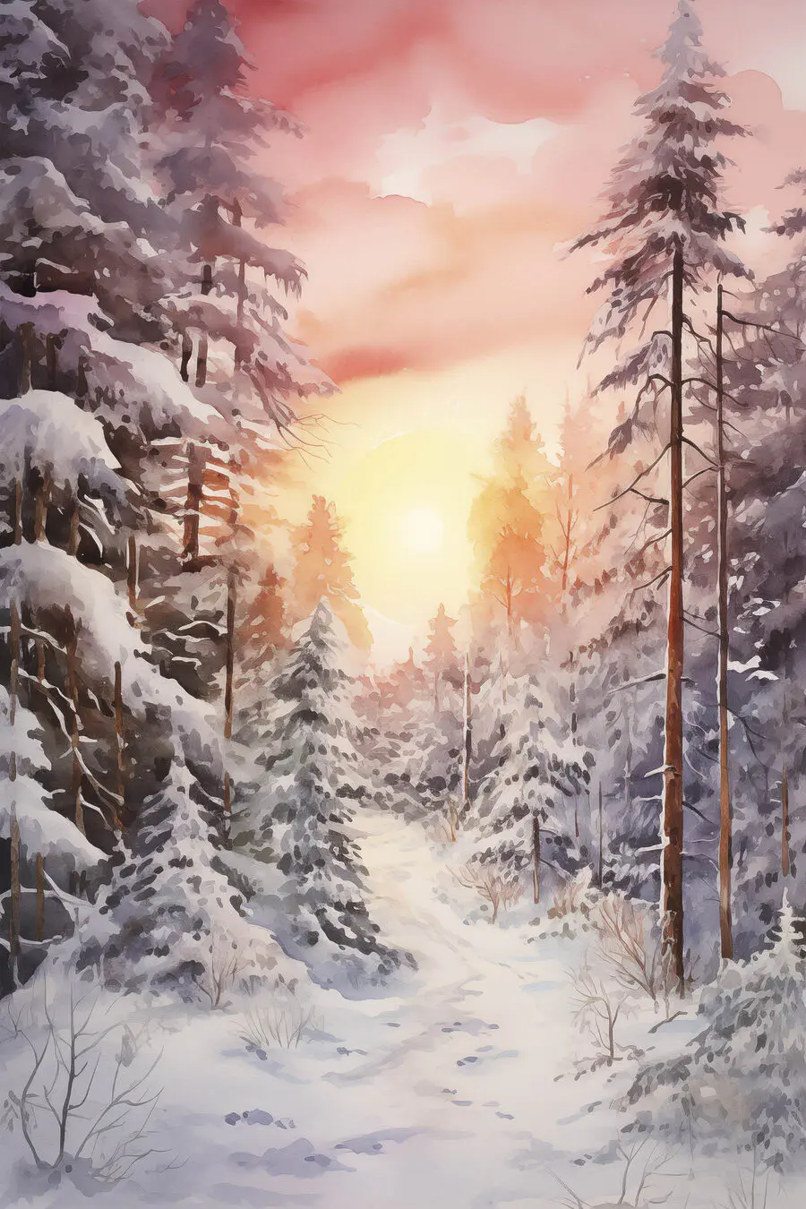 Verwandeln Sie Ihren Raum in ein Winterwunderland mit diesem bezaubernden Aquarellbild eines verschneiten Waldes. Die sanften Farbtöne gehen nahtlos ineinander über und fangen den magischen Moment ein, wenn die Sonne durch die hohen Evergreens scheint und die Winterlandschaft in ein warmes Licht taucht. Stellen Sie sich vor, wie Sie es sich mit einer kuscheligen Decke und einer Tasse heißem Kakao in der Hand gemütlich machen und sich in der stillen Schönheit der Natur verlieren. Dieses Kunstwerk ist nicht einfach nur Kunst – es ist eine Einladung zum Träumen von verschneiten Abenteuern, ruhigen Spaziergängen und der friedlichen Stille eines verschneiten Weges. Es passt in jeden Raum und verleiht ihm einen Hauch von Ruhe und Charme. Wer würde sich nicht gerne ein Stück dieser heiteren Szene an die Wand hängen?