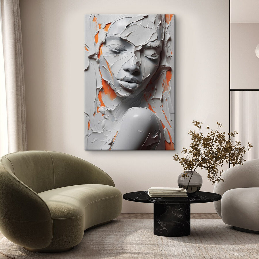 Tauchen Sie mit diesem Leinwanddruck in eine Welt ein, in der Schönheit und Geheimnis aufeinandertreffen. Das markante Bild eines Frauengesichts, das von einer glatten weißen Farbschicht umhüllt ist, zieht die Aufmerksamkeit auf sich und weckt die Neugierde. Es ist wie eine nachdenkliche Pause an einem hektischen Tag – ein Moment, der zum Nachdenken einlädt. Stellen Sie sich dieses lebendige Werk in einer gemütlichen Ecke oder einem modernen Wohnzimmer vor, wo es zu einem Gespräch beim Kaffee oder zu einer stillen Betrachtung während des abendlichen Ausklingens einlädt. Das warme Orange, das durchscheint, verleiht ihm genau die richtige Prise Schwung und macht es zu mehr als nur Kunst – es ist ein Hauch von frischem Wind für jeden Raum. Auf jeden Fall ein Hingucker!