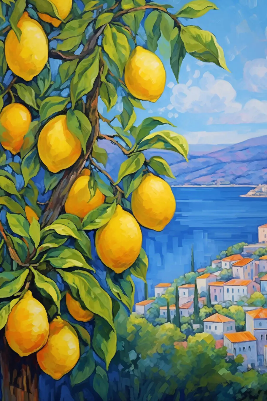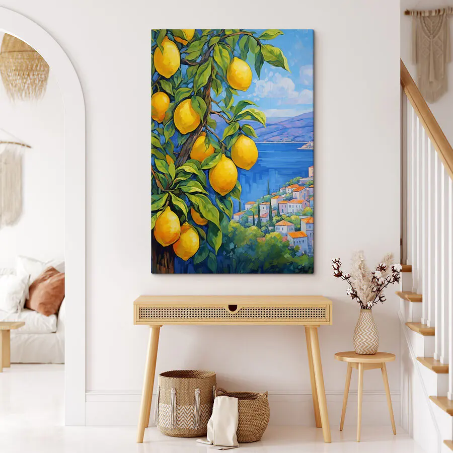Dieser lebendige Leinwanddruck eines Zitronenbaums, der eine charmante Stadt im Hintergrund perfekt einrahmt, bringt jeden Raum zum Strahlen. Die satten Gelbtöne der Zitronen tanzen gegen das kühle Blau des Wassers, fast wie ein für immer festgehaltener sonniger Tag. Stellen Sie sich vor, Sie betreten Ihr Zimmer und fühlen sich wie in einem sonnendurchfluteten Obstgarten. Es ist eine Erinnerung an wärmere Tage, frische Limonade und faule Nachmittage. Dieses Stück ist nicht nur Kunst, sondern ein Stück Leben, das ein Lächeln hervorruft und Träume von Reisen und Entdeckungen weckt. Perfekt für eine Küche oder eine gemütliche Ecke!