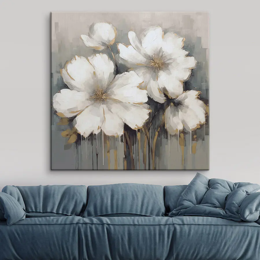 Verschönern Sie jeden Raum mit diesem schönen Leinwanddruck mit eleganten weißen Blumen. Stellen Sie sich vor, Sie betreten einen Raum mit sanftem Licht und werden von diesen herrlichen Blüten begrüßt. Sie verbreiten eine frische Ausstrahlung, die Ihr Herz leicht fühlen lässt. Die sanften Farbtöne und zarten Details schaffen eine einladende Atmosphäre, in der man sich mit einer Tasse Tee entspannen oder in ein gutes Buch vertiefen kann. Außerdem ist er ein toller Gesprächsanlass – Gäste werden seine Schönheit sicher bewundern! Ob im Wohnzimmer oder in einer gemütlichen Ecke, dieses Stück strahlt eine heitere, fast verträumte Stimmung aus. Es ist wie ein Hauch von frischer Luft, direkt an Ihrer Wand!