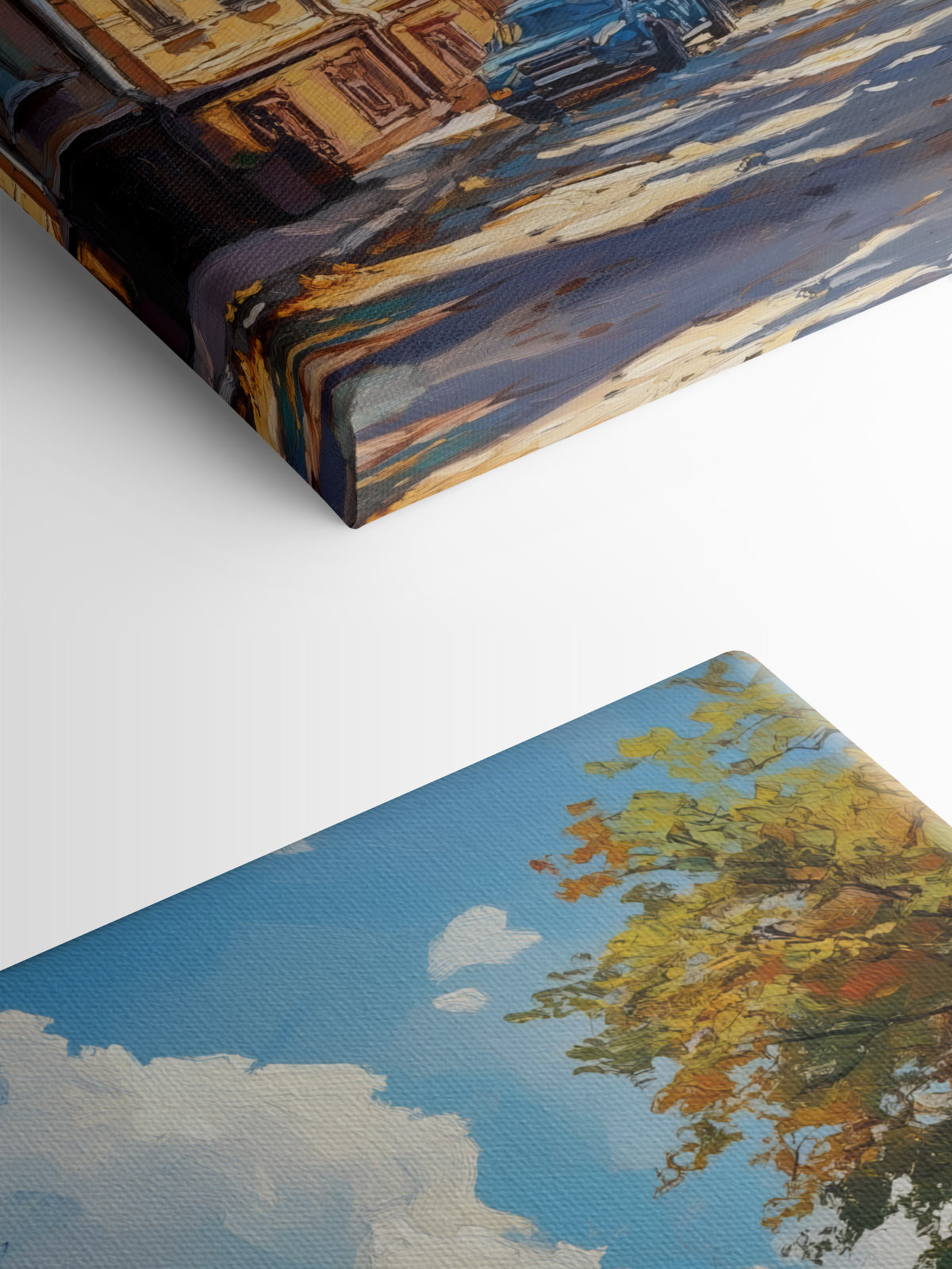 Dieses farbenfrohe Leinwandbild mit dem Titel “Street with Cars Parked on It” fängt einen sonnigen Tag in der Stadt ein, an dem reizvolle Architektur auf das Alltagsleben trifft. Stellen Sie sich vor, dass Sie sich in die Gelb- und Blautöne fallen lassen, dass Sie das Gefühl haben, diese einladende Straße entlangzuschlendern, und dass Sie vielleicht von den Geschichten träumen, die diese geparkten Autos erzählen könnten. Die verspielten Wolken am Himmel und das warme Sonnenlicht schaffen eine lebendige Kulisse, die Ihrer Einrichtung einen Hauch von Laune verleiht.