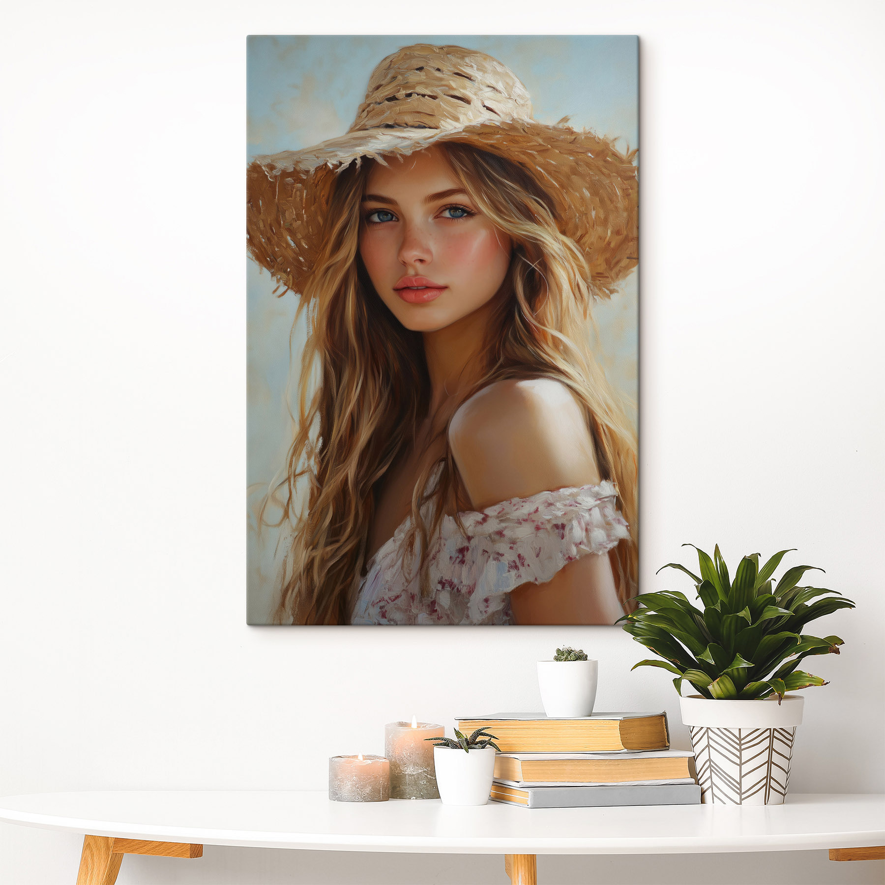 Tauchen Sie mit diesem atemberaubenden Leinwanddruck in eine Welt des Sonnenglücks ein. Die heitere Frau mit dem Strohhut erzählt Geschichten von Sommertagen und unbeschwerten Abenteuern. Die zarten Farben und der sanfte Ausdruck laden zu einem Gefühl der Ruhe ein und eignen sich perfekt zur Verschönerung einer gemütlichen Ecke oder einer Galeriewand.
