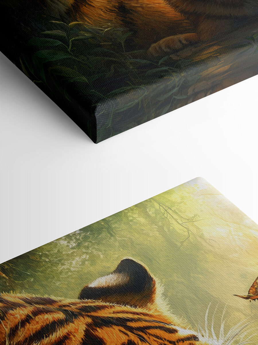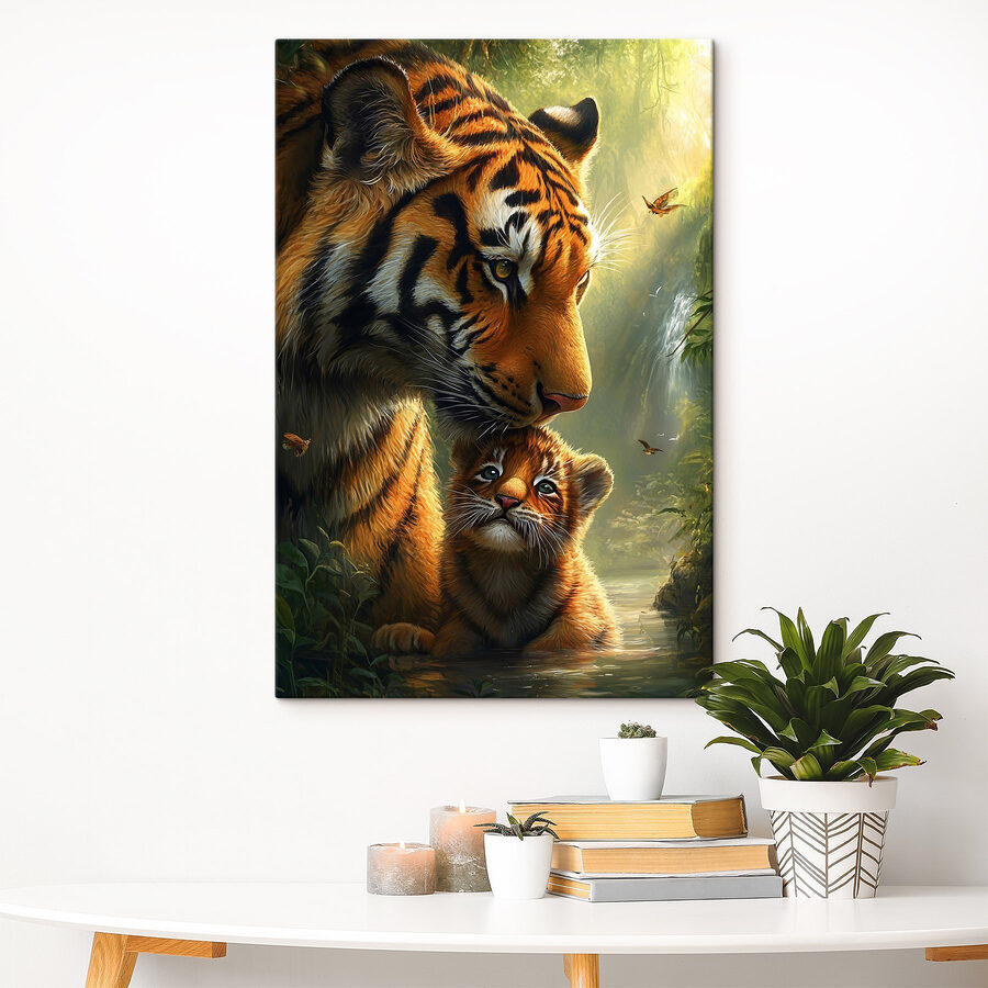 Tauchen Sie ein in die Wildnis mit diesem atemberaubenden Leinwandbild, das einen Tiger und sein süßes Jungtier zeigt, perfekt eingebettet in eine üppige Dschungelszene. Der Blick dieses kleinen Plüschbällchens lässt das Herz höher schlagen, nicht wahr? Stellen Sie sich dieses Bild in einer gemütlichen Ecke vor, wo es zu Gesprächen anregt und vielleicht sogar ein paar Tagträume von Safaris und sonnenbeschienenen Wegen weckt. Die leuchtenden Farben bringen einen Hauch von Natur ins Haus und erinnern jeden an die Schönheit vor unserer Haustür. Es ist, als hätte man ein kleines Stückchen Wildnis direkt in seinem Zuhause! Perfekt für Tierliebhaber oder alle, die ihrer Einrichtung einen wilden Charme verleihen wollen. Und wer wünscht sich nicht eine tägliche Dosis Niedlichkeit?