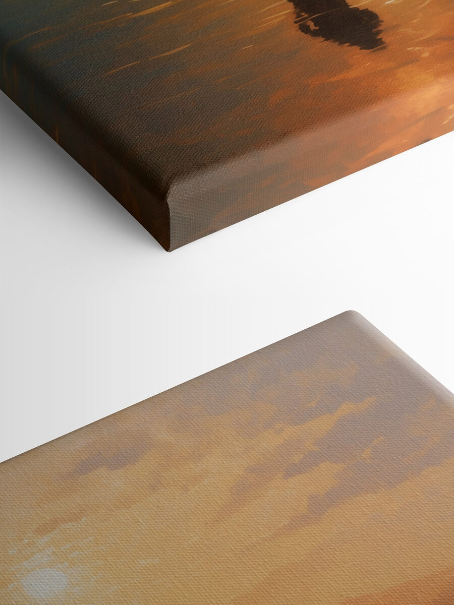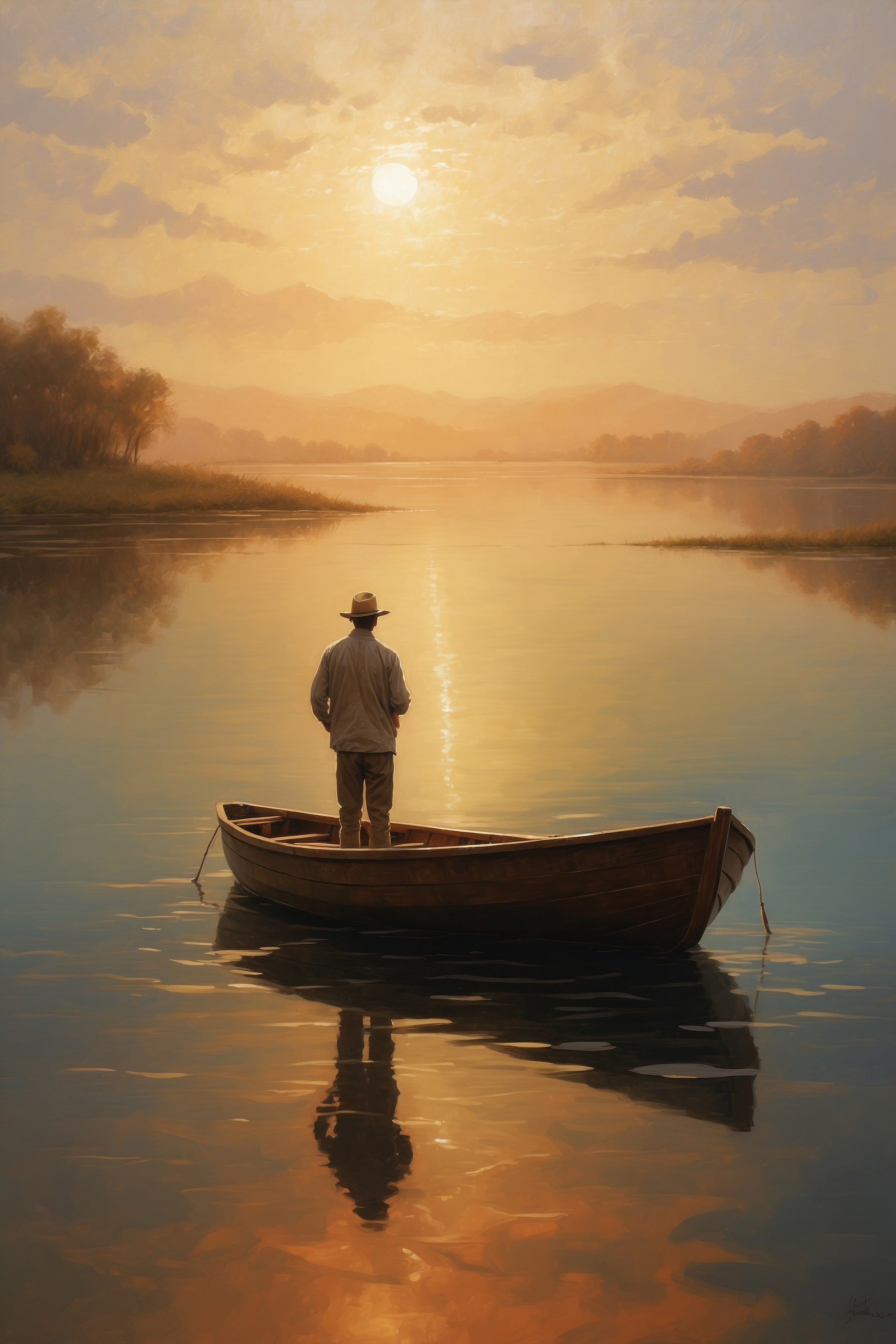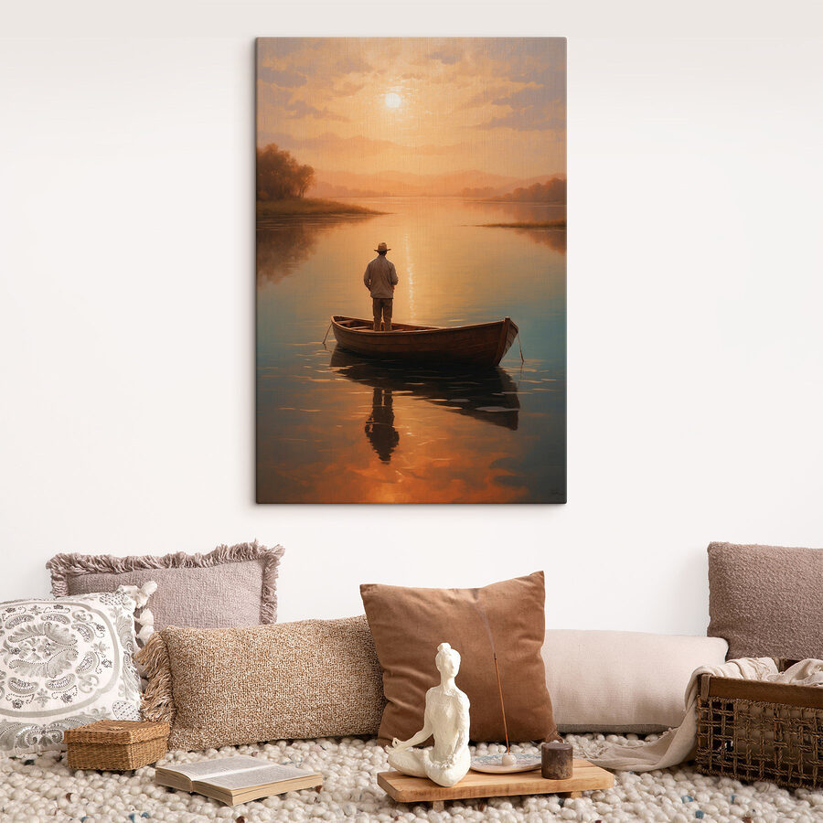 Stellen Sie sich vor: ein friedlicher See bei Sonnenuntergang, in dem eine einsame Person in einem gemütlichen Boot sitzt und in Gedanken versunken den Tag ausklingen lässt. Dieser Leinwanddruck fängt diesen heiteren Moment wunderschön ein. Es ist nicht nur Kunst, es ist wie eine sanfte Umarmung für einen Raum, der ein bisschen mehr Wärme braucht. Stellen Sie sich vor, es hängt in einem Wohnzimmer und regt zu Gesprächen über Abenteuer oder Tagträume an. Es flüstert der Seele zu und weckt die Sehnsucht nach einfacheren Zeiten. Perfekt für Naturliebhaber oder alle, die ihrer Einrichtung einen Hauch von Ruhe verleihen möchten. Stellen Sie sich vor, Sie machen es sich mit einer Tasse Tee gemütlich und lassen sich von dieser Szene in ruhige Gewässer entführen.