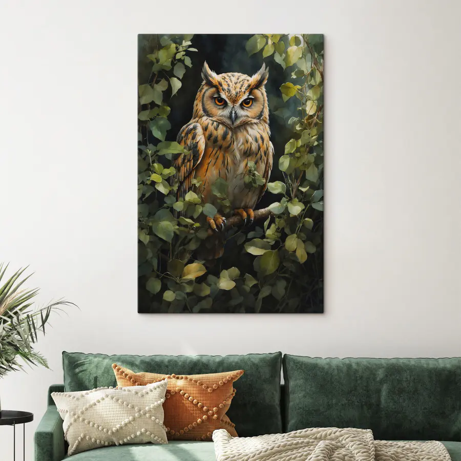 Lernen Sie Ihren neuen Lieblings-Wandbegleiter kennen – einen atemberaubenden Leinwanddruck mit einer Eule, die anmutig auf einem Ast sitzt, umgeben von üppigem Grün. Dieses bezaubernde Stück ist nicht nur Kunst, sondern holt die Natur direkt in Ihr Wohnzimmer. Stellen Sie sich gemütliche Abende mit dieser majestätischen Kreatur vor, die den Raum im Auge behält. Die leuchtenden Farben und filigranen Details lassen es lebendig erscheinen, fast so, als könnte es Sie nach Einbruch der Dunkelheit anschreien.