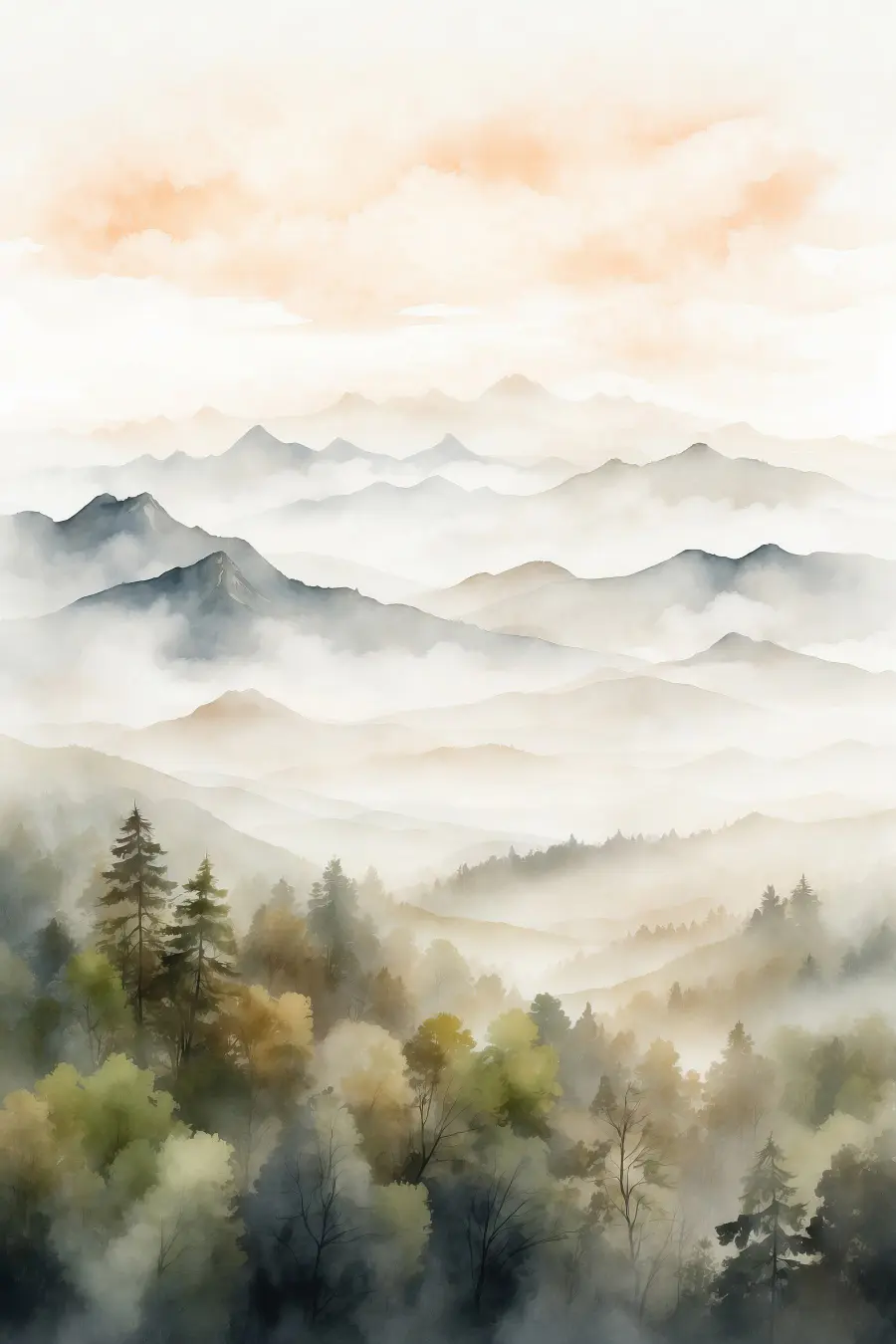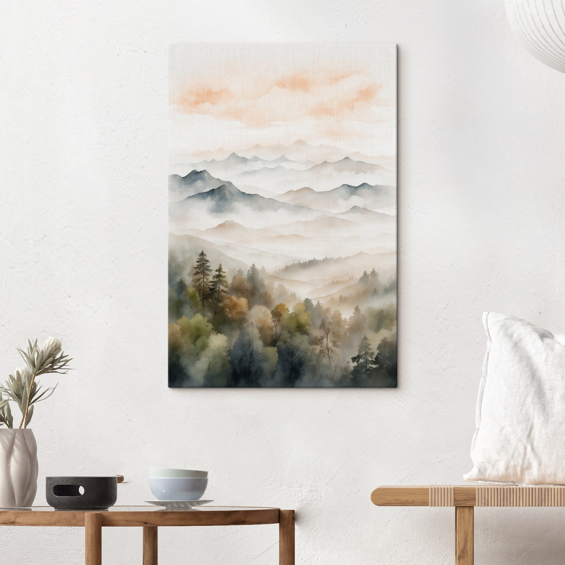 Gestalten Sie Ihren Raum mit diesem atemberaubenden Aquarellbild, das Berge und Bäume in einem verträumten Dunst einfängt. Stellen Sie sich vor, Sie schlürfen Ihren Morgenkaffee, eingewickelt in eine Decke, während sanfte Grün- und Orangetöne über Ihre Wände fließen und Sie sanft an friedliche Wanderungen im Wald erinnern. Diese ruhige Atmosphäre lässt Sie sich sofort wohlfühlen – wie ein kleiner Ausflug in den Alltag. Perfekt für ein gemütliches Wohnzimmer oder ein ruhiges Schlafzimmer, lädt dieses Stück die Natur ins Haus ein. Wer wünscht sich nicht ein kleines Stückchen Waldmagie, um den Tag zu verschönern?
