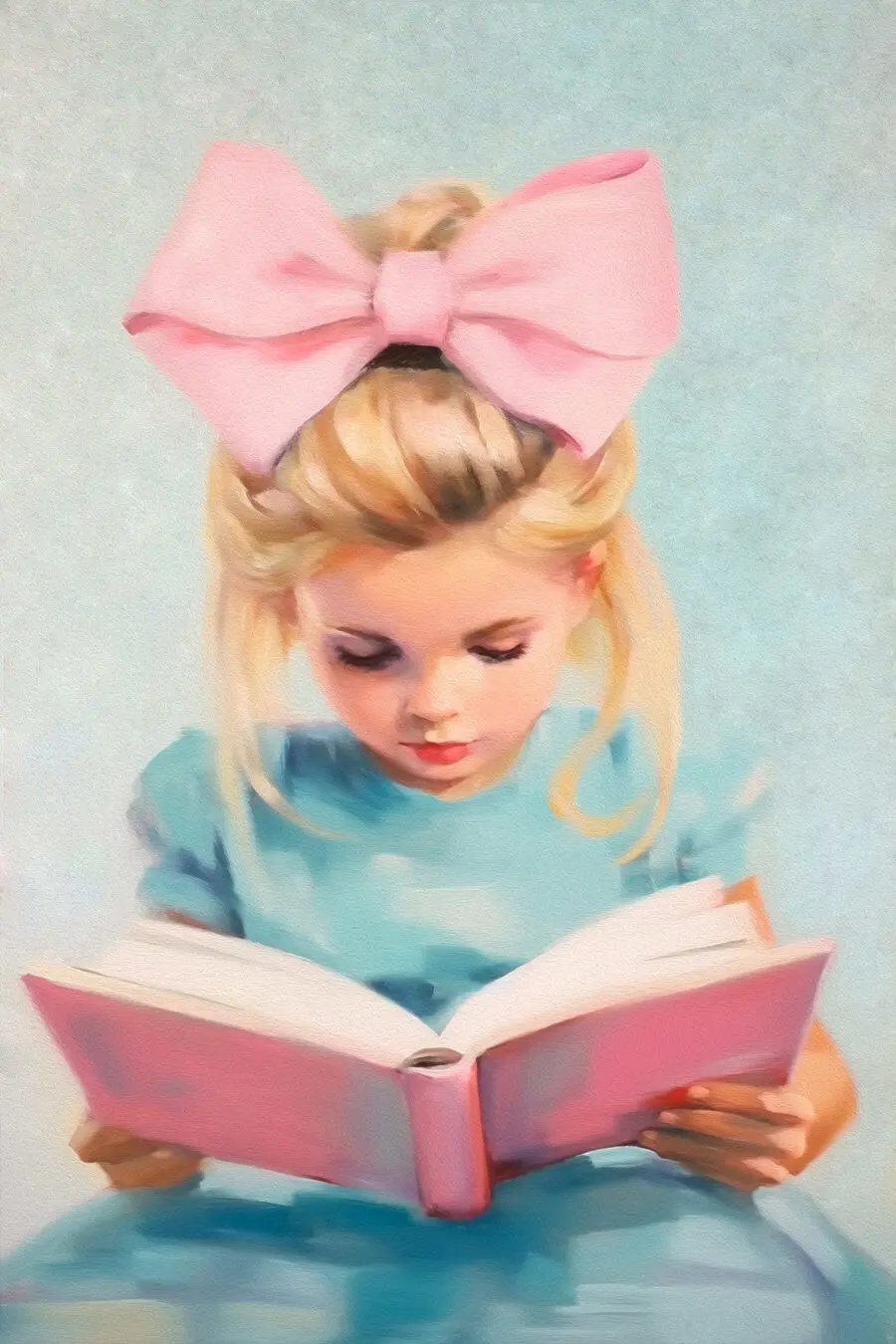 Dieser charmante Leinwanddruck mit einem süßen Mädchen, das in sein Buch vertieft ist, und einer entzückenden rosafarbenen Schleife, die die Geheimnisse der Kindheit zu verraten scheint, verwandelt jeden Raum. Stellen Sie sich vor, wie dieses fröhliche Bild ein Spielzimmer oder eine gemütliche Leseecke schmückt – stellen Sie sich vor, wie die Kleinen sich darum versammeln und sich in ihre eigenen Abenteuer stürzen. Die zarten Farbtöne sind wie eine sanfte Umarmung für die Augen und eignen sich perfekt, um die Fantasie zu beflügeln. Es ist nicht nur Dekoration, sondern ein Stück, das zu Geschichten und Tagträumen einlädt und jeden Blick zu einem Erlebnis macht, das sich lohnt. Ganz ehrlich, wer würde nicht gerne mit ihr zusammen in dieses Buch schlüpfen?