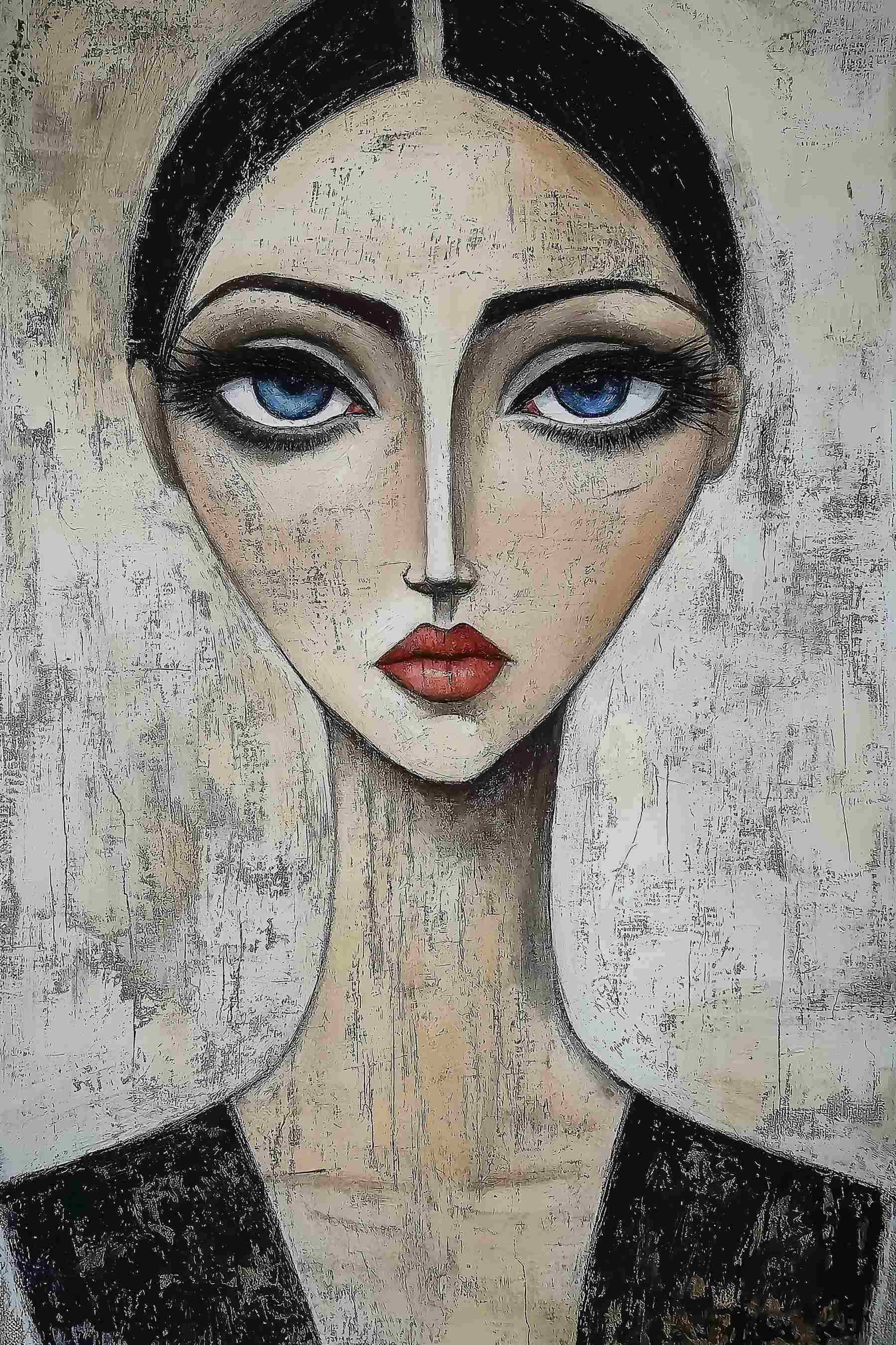 Stellen Sie sich vor, Sie betreten einen Raum und werden von diesem eindrucksvollen Leinwandbild begrüßt. Es ist, als ob man sich mit jemandem unterhält, der gleichzeitig geheimnisvoll und warm ist. Die tiefblauen Augen der Frau scheinen dich in ihren Bann zu ziehen und lassen dich über ihre Geschichte nachdenken. Ist sie eine Tagträumerin oder eine wilde Kriegerin?