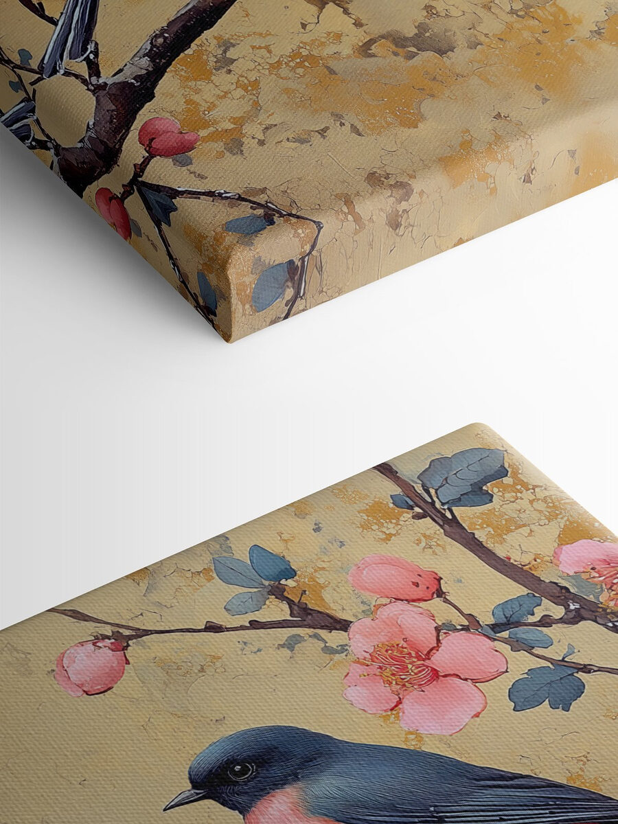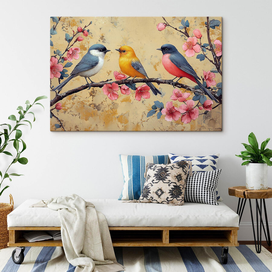 Verschönern Sie jeden Raum mit diesem charmanten Leinwandbild, das ein reizendes Vogel-Trio auf einem mit Blumen geschmückten Ast zeigt. Jeder der gefiederten Freunde bringt seinen eigenen Farbtupfer mit und verleiht Ihren Wänden einen Hauch von natürlicher Laune. Stellen Sie sich dieses farbenfrohe Stück in einer gemütlichen Ecke vor, wo es das Rampenlicht stiehlt und jedes Mal ein Lächeln hervorruft, wenn jemand vorbeigeht. Es ist, als hätte man ein kleines Stückchen Natur zu Hause – perfekt für Naturliebhaber oder alle, die ihre Einrichtung aufpeppen wollen. Hängen Sie es auf, lehnen Sie sich zurück und lassen Sie sich von der fröhlichen Stimmung anstecken!