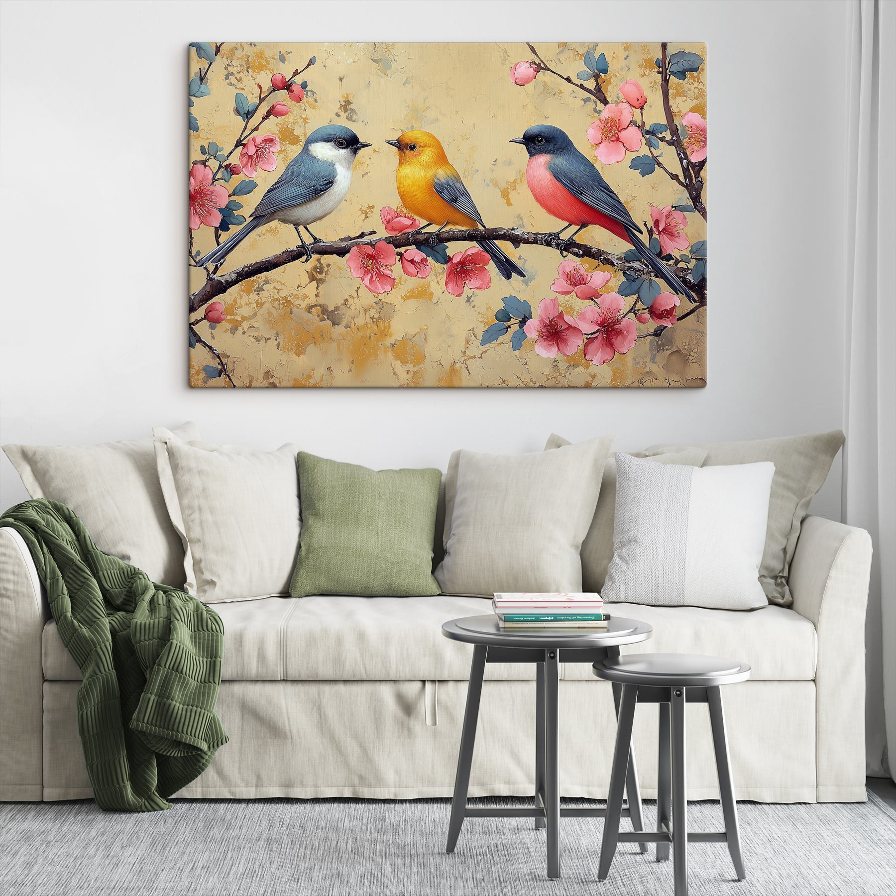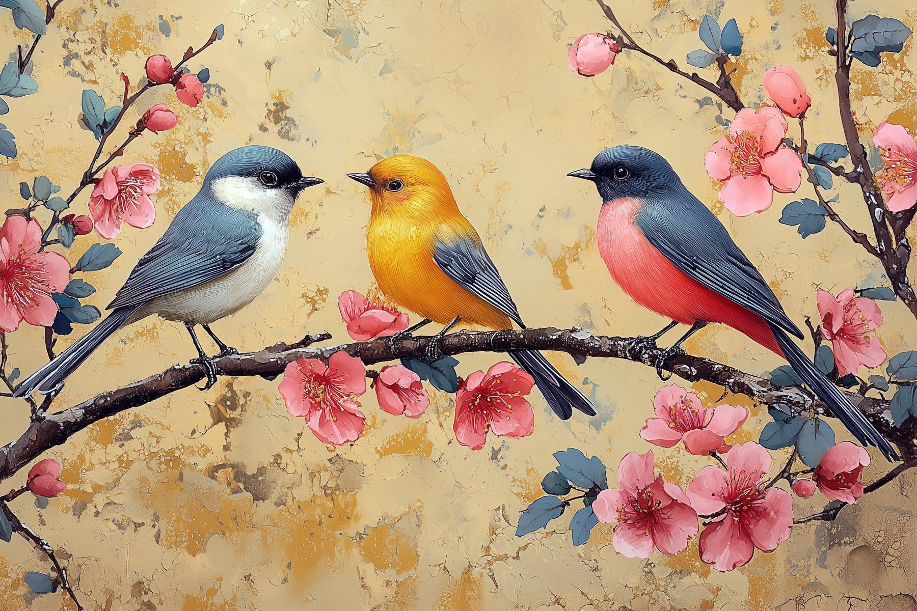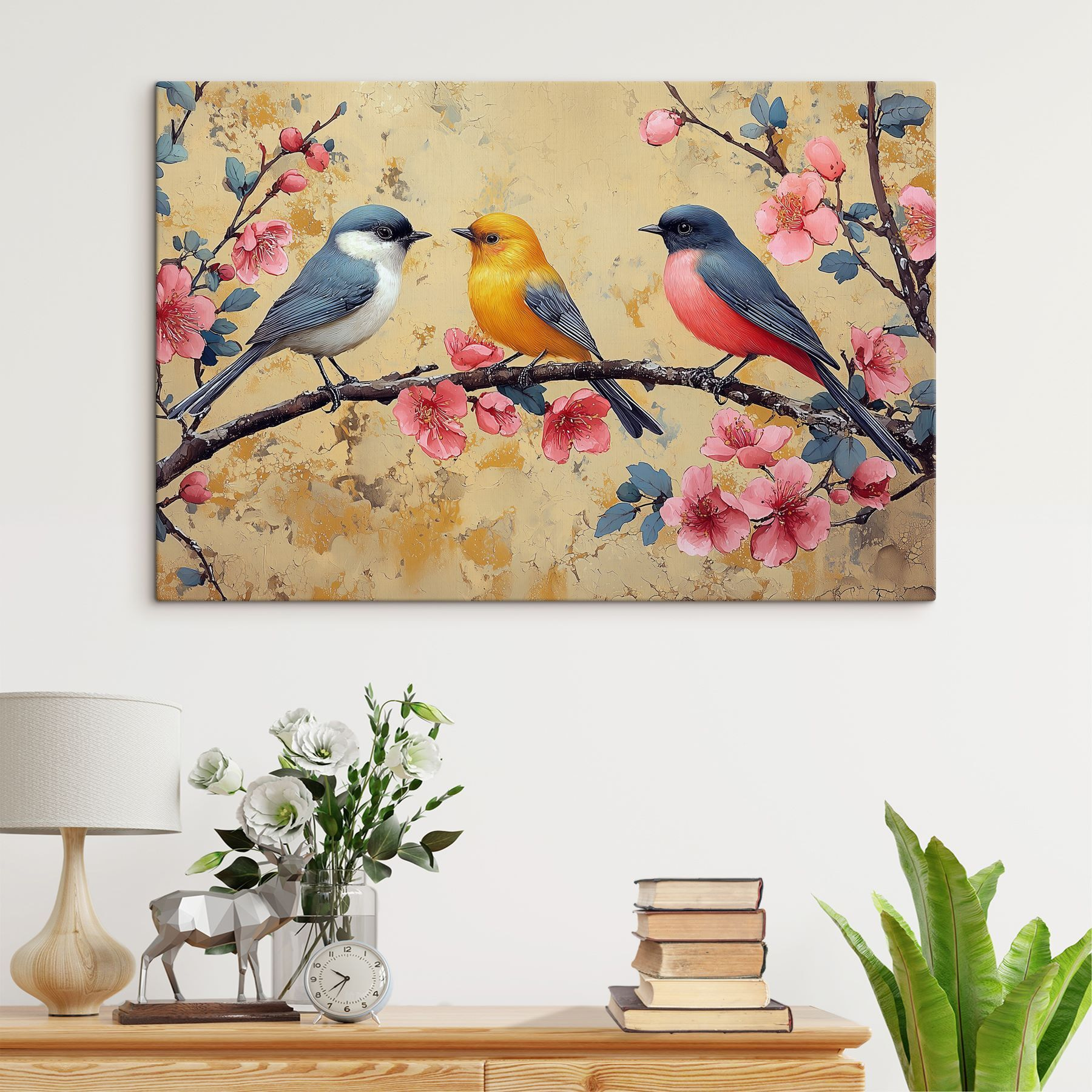 Verschönern Sie jeden Raum mit diesem charmanten Leinwandbild, das ein reizendes Vogel-Trio auf einem mit Blumen geschmückten Ast zeigt. Jeder der gefiederten Freunde bringt seinen eigenen Farbtupfer mit und verleiht Ihren Wänden einen Hauch von natürlicher Laune. Stellen Sie sich dieses farbenfrohe Stück in einer gemütlichen Ecke vor, wo es das Rampenlicht stiehlt und jedes Mal ein Lächeln hervorruft, wenn jemand vorbeigeht. Es ist, als hätte man ein kleines Stückchen Natur zu Hause – perfekt für Naturliebhaber oder alle, die ihre Einrichtung aufpeppen wollen. Hängen Sie es auf, lehnen Sie sich zurück und lassen Sie sich von der fröhlichen Stimmung anstecken!