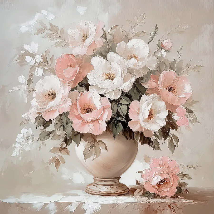 Verschönern Sie jeden Raum mit diesem entzückenden Leinwanddruck von Blumen in einer Vase. Es ist, als ob man einen ganzen Garten ins Haus holt, ohne dass man ihn gießen muss – kein grüner Daumen erforderlich! Mit ihren sanften Rosa- und Weißtönen wirken diese Blüten wie eine sanfte Umarmung für Ihre Wände. Stellen Sie sich vor, wie Sie morgens gemütlich an Ihrem Kaffee nippen und dieses Kunstwerk das Licht genau richtig einfängt, um alles noch ein bisschen besonderer zu machen. Es ist perfekt, um Ihrem Raum einen Hauch von natürlichem Charme zu verleihen. Und wer liebt nicht einen Hauch von floralem Flair? Ein Gesprächsanlass für alle!
