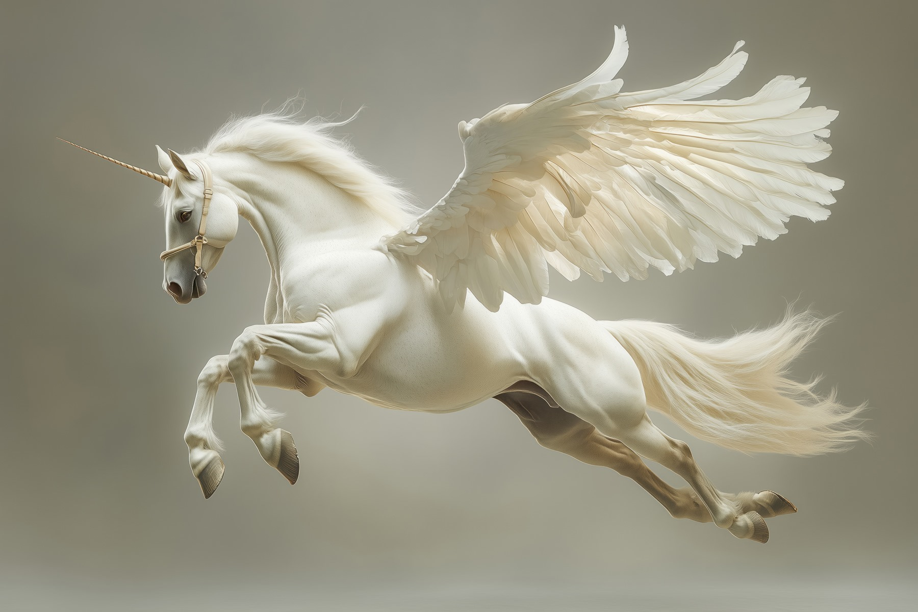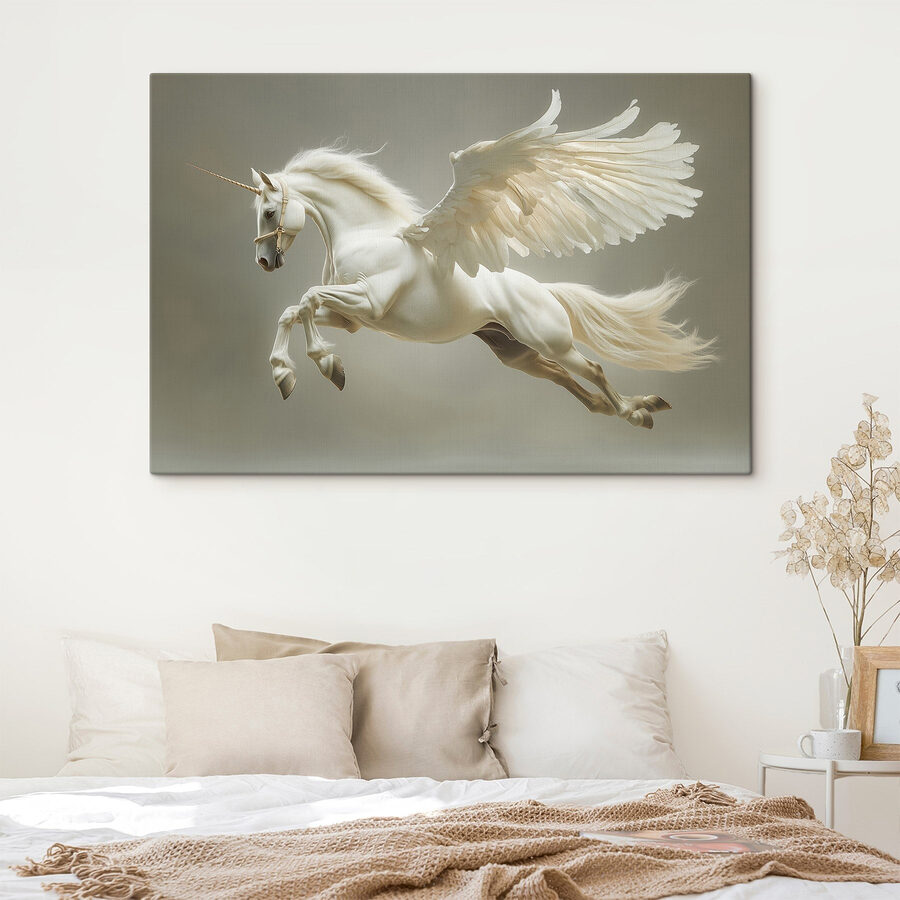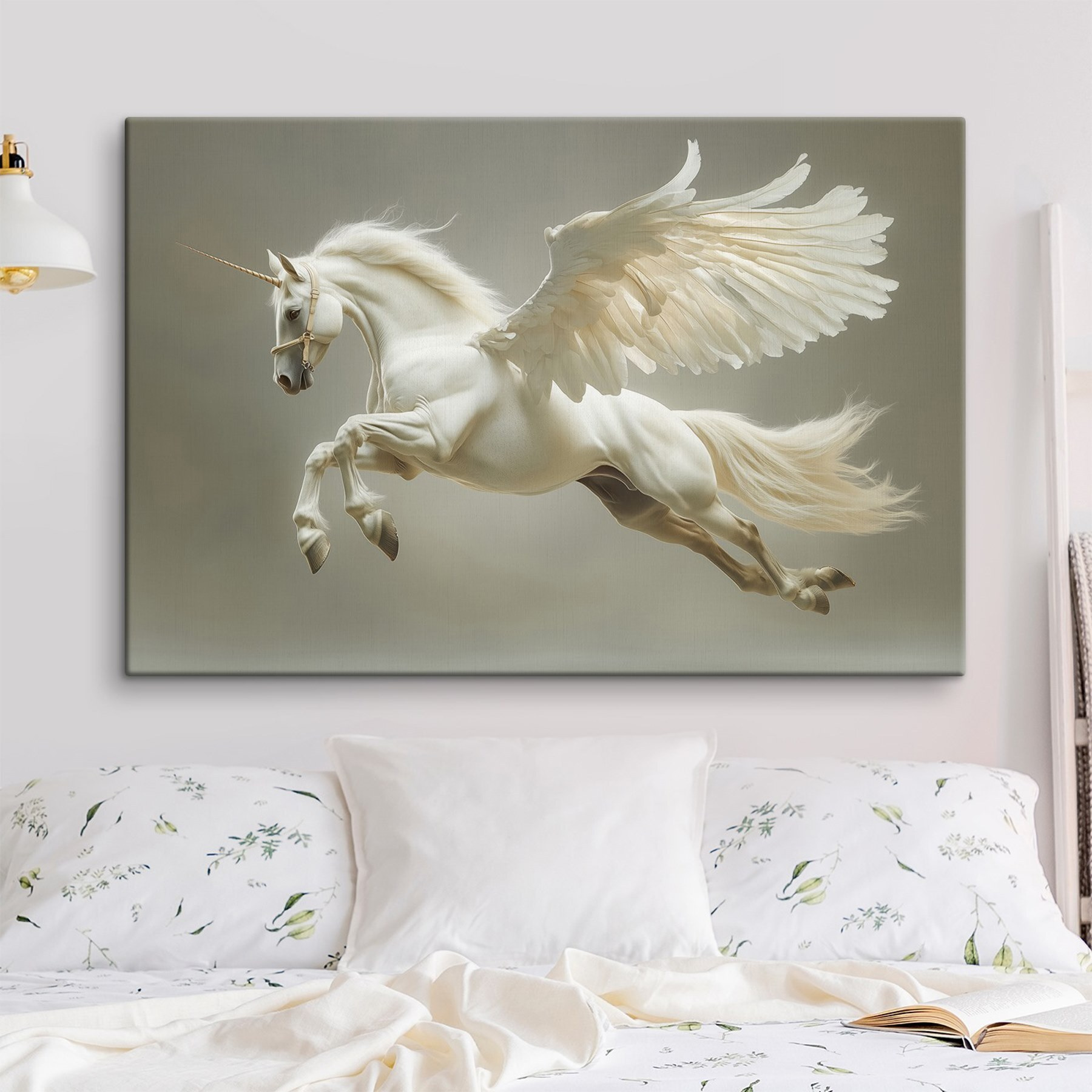 Stellen Sie sich dieses atemberaubende Leinwandbild eines weißen Pferdes mit Flügeln an Ihrer Wand vor. Es ist nicht nur Kunst, sondern auch ein Stück Laune, das Sie jedes Mal zum Lächeln bringt, wenn Sie daran vorbeigehen. Stellen Sie sich diese majestätische Kreatur vor, wie sie durch sanfte Wolken schwebt und uns daran erinnert, dass der Fantasie keine Grenzen gesetzt sind. Die subtilen Farbtöne schaffen eine beruhigende Atmosphäre, die perfekt für eine gemütliche Leseecke oder ein lebhaftes Wohnzimmer ist. Vielleicht bleiben Ihre Freunde einfach stehen und fragen sich, ob sie auf dieser Schönheit reiten können. Es erobert die Herzen und wird mit Sicherheit Freude und einen Hauch von Magie im Alltag verbreiten. Was kann man sich mehr wünschen?