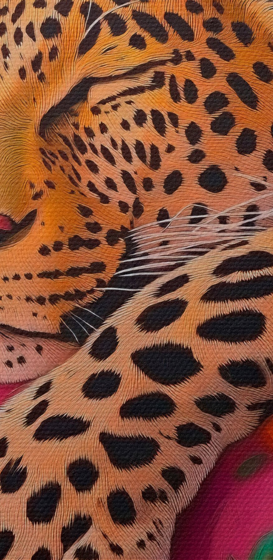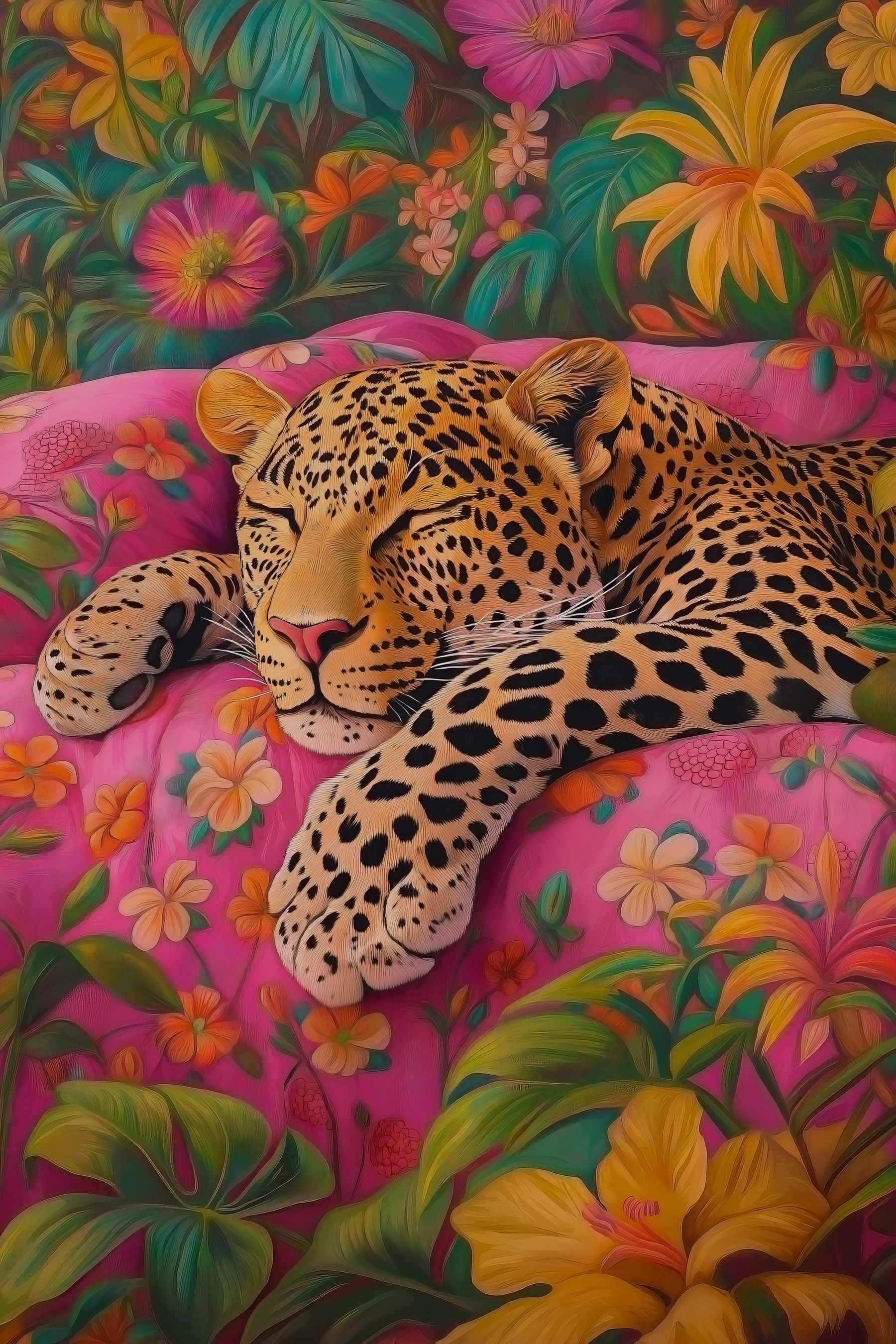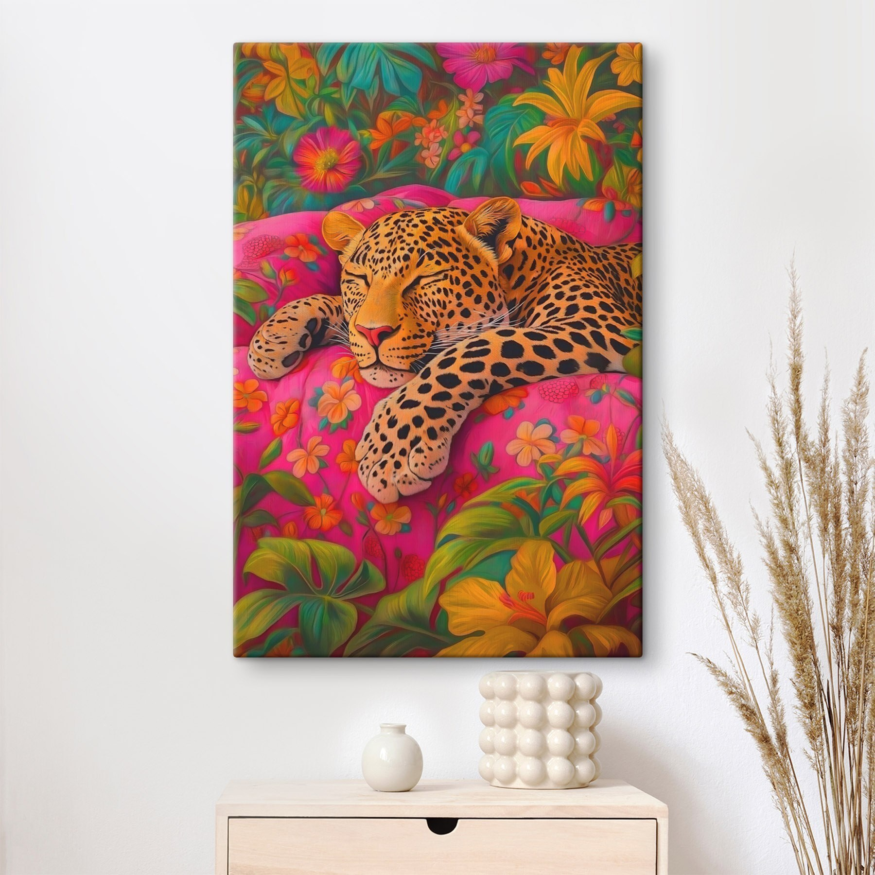 Stellen Sie sich vor: eine gemütliche Ecke in Ihrem Wohnzimmer und ein Leopard, der auf einer rosafarbenen Couch, umgeben von leuchtenden Blumen, schlummert. Dieser Leinwanddruck ist nicht nur Kunst, sondern auch ein Stimmungsaufheller! Stellen Sie sich das sanfte Rauschen eines Katzenschlafs direkt in Ihrem Raum vor, mit all den satten Farben, die Freude und Laune verbreiten. Das Bild ist perfekt für Tierliebhaber und sorgt für einen Hauch von Spaß und Abenteuer – auch wenn Ihre Einrichtung eher eine ruhige Oase” als eine Dschungelsafari” ist. Ein Gesprächsanlass ist es allemal! Ihre Freunde werden sich fragen, ob Sie ein Haustier haben oder einfach nur ein tolles Auge für einzigartige Dekoration. Zeigen Sie sich von Ihrer wilden Seite und lassen Sie diesen verschlafenen Leoparden Wärme und Charme an Ihre Wände bringen. Wer hätte gedacht, dass eine Katze so stilvoll aussehen kann?