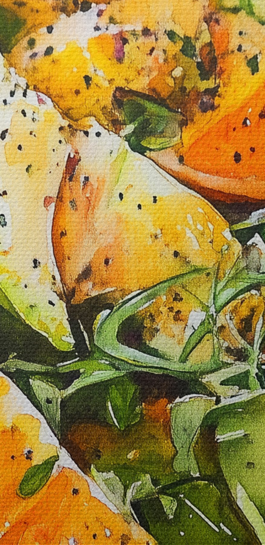 Verwandeln Sie eine Wand in eine frische Geschmacksexplosion mit dem “Wandbilder Plate of Fruit and Vegetables”. Dieses farbenfrohe Kunstwerk zeigt eine köstliche Mischung aus saftigen Orangen, knackigem Grün und zarten Kräutern und eignet sich perfekt für Küchen oder Esszimmer. Stellen Sie sich vor, Sie genießen eine Mahlzeit, während dieses farbenfrohe Kunstwerk Ihr Auge fesselt. Das ist wie eine kleine Gartenparty bei Ihnen zu Hause – nur ohne die lästigen Käfer! Außerdem wirken die Aquarellspritzer wie ein Kunstwerk, das direkt von einem sonnigen Tag auf dem Markt stammt. Verschönern Sie Ihren Raum und regen Sie vielleicht sogar ein paar gesunde Essgewohnheiten an – oder zumindest die Lust auf einen Snack!