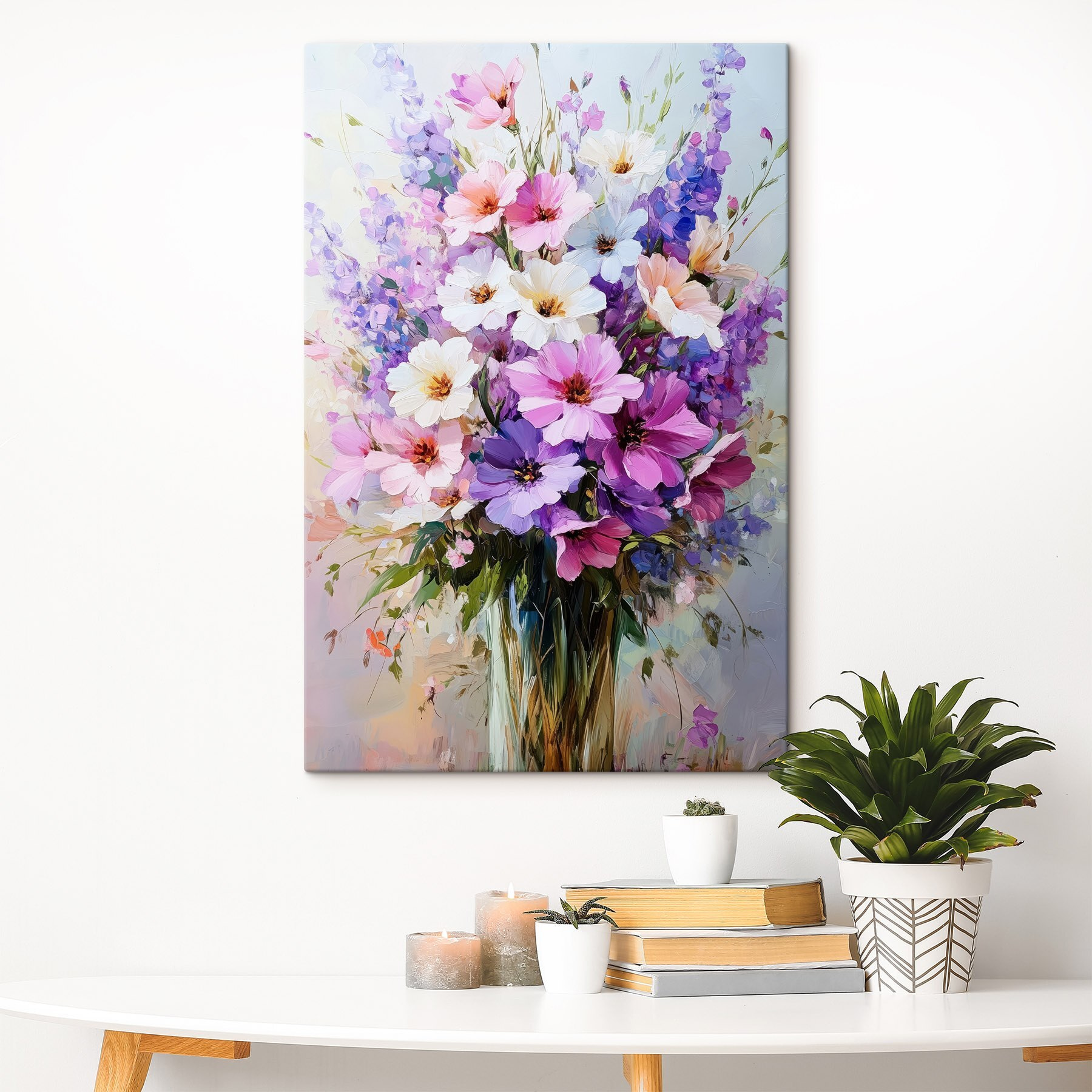Verschönern Sie jeden Raum mit diesem atemberaubenden Leinwanddruck von Blumen in einer Vase. Es ist, als hätte man einen Mini-Garten an der Wand hängen – ohne die lästige Bewässerung! Die rosafarbenen, violetten und weißen Farbtupfer schaffen eine fröhliche Atmosphäre, die die Stimmung sofort heben kann. Stellen Sie sich vor: eine gemütliche Kaffeeecke, die von Sonnenlicht durchflutet wird, und dieses wunderschöne Kunstwerk, das einen Hauch von Natur vermittelt. Gäste werden Ihren Geschmack loben und sich wundern, wie Sie es schaffen, Ihr Zuhause so frisch und einladend zu gestalten. Eine kleine Freude für alle Blumenliebhaber und Naturfreunde!