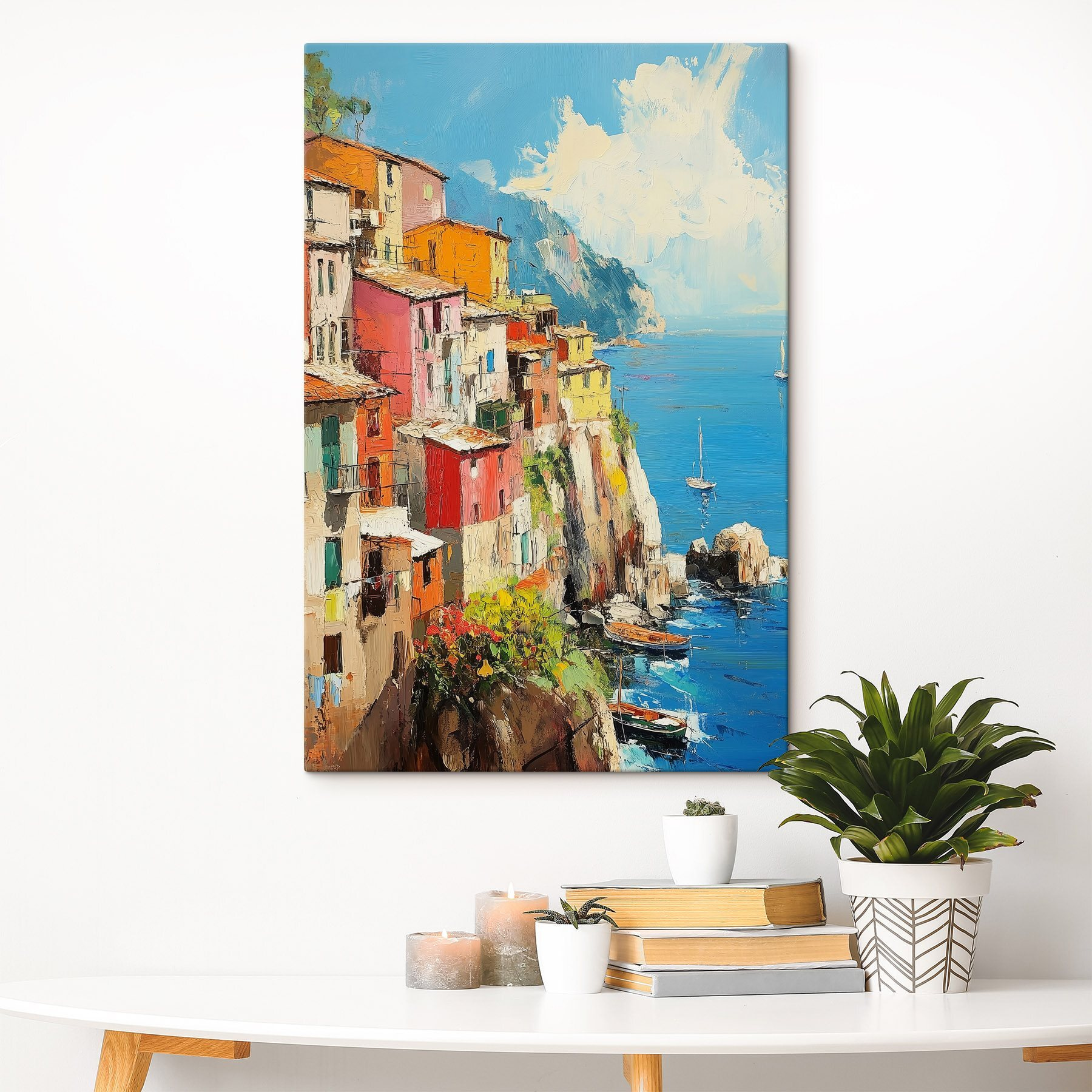 Verwandeln Sie jeden Raum in einen gemütlichen Zufluchtsort mit diesem lebendigen Leinwanddruck einer charmanten Stadt auf einer Klippe am Meer. Die farbenfrohen Gebäude scheinen im Sonnenlicht zu tanzen, als würden sie eine eigene kleine Party feiern! Stellen Sie sich vor, Sie schlürfen einen Kaffee, während Sie diese Szene betrachten; es ist fast so, als könnten Sie die Wellen gegen die Felsen schlagen hören und die warme Brise spüren. Perfekt für Reiseliebhaber oder alle, die sich nach einem Farbtupfer in ihrem Leben sehnen. Dieses Werk ist nicht nur Kunst, es ist eine Einladung zum Träumen, zum Wandern und vielleicht, nur vielleicht, zum Planen des nächsten Ausflugs.