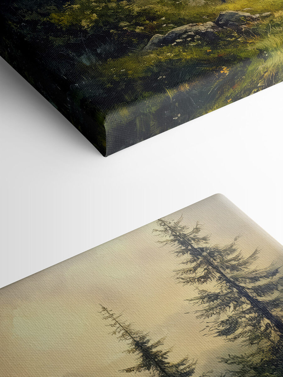 Stellen Sie sich vor, dass Sie mit diesem atemberaubenden Leinwandbild in einen ruhigen Wald eintreten. Es ist, als würde man sich auf einen friedlichen Bergpfad begeben, wo die Bäume Geheimnisse über die Natur flüstern. Die Farben tanzen miteinander, von den üppigen Grüntönen bis hin zu der sanften, gedämpften Atmosphäre, die auf die Morgendämmerung hindeutet. Egal, ob Sie es in einem gemütlichen Wohnzimmer oder einem beruhigenden Schlafzimmer aufhängen, es bringt ein Stück Natur ins Haus. Stellen Sie sich einen sonnigen Nachmittag vor, an dem Sie in der Nähe faulenzen, oder vielleicht einen ruhigen Abend, eingemummelt in eine Decke. Dieses Kunstwerk ist nicht nur Dekoration, sondern auch eine Einladung zum Durchatmen, Entspannen und zum Abschalten. Perfekt für Naturliebhaber oder alle, die eine friedliche Atmosphäre zu Hause suchen.