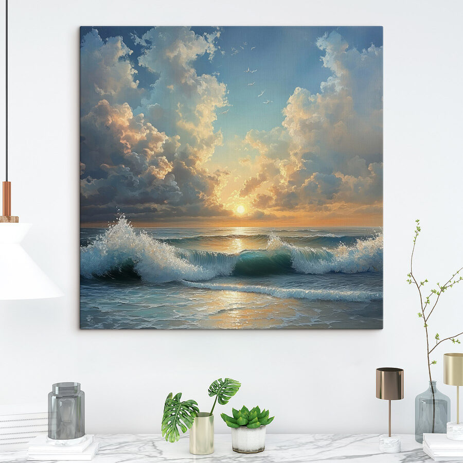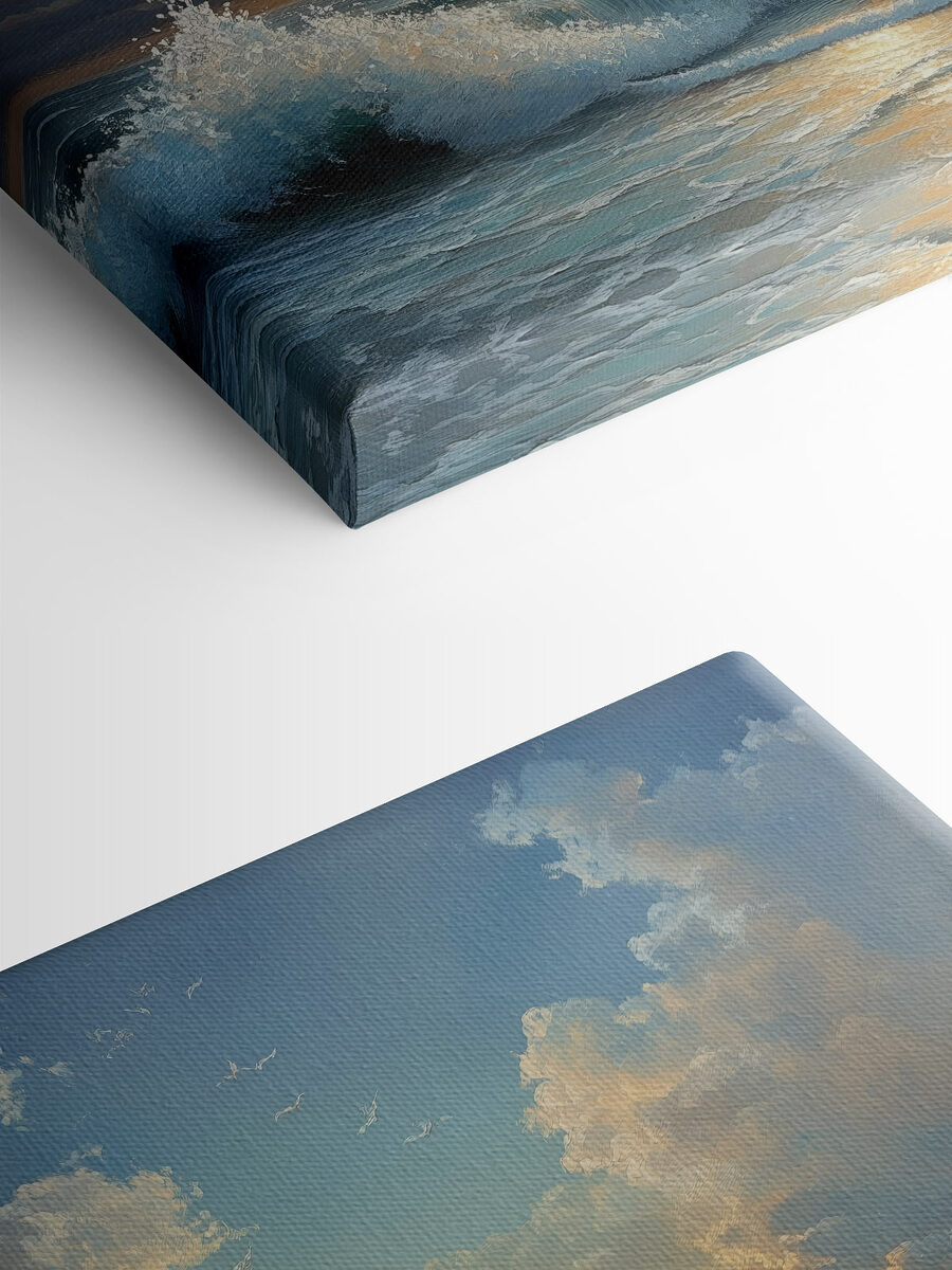 Stellen Sie sich vor, Sie stehen am Strand, die Wellen plätschern spielerisch an Ihre Füße, während die Sonne hinter dem Horizont verschwindet. Dieser Leinwanddruck fängt diesen heiteren Moment ein und bringt die Schönheit des Strandes direkt in Ihren Wohnbereich. Es ist wie ein Mini-Urlaub an der Wand – nur ohne Sonnencreme. Die leuchtenden Blautöne und die sanften Farben des Sonnenuntergangs laden zu Tagträumen von einem Urlaub am Meer und faulen Strandtagen ein. Hängen Sie es in einer gemütlichen Ecke auf und beobachten Sie, wie sich Ihre Freunde in seinem beruhigenden Charme verlieren. Dieses Kunstwerk ist perfekt für alle, die einen Hauch von Freude an der Natur brauchen und versprüht süße Urlaubsgefühle. Lassen Sie sich entführen, wenn auch nur für einen Moment.
