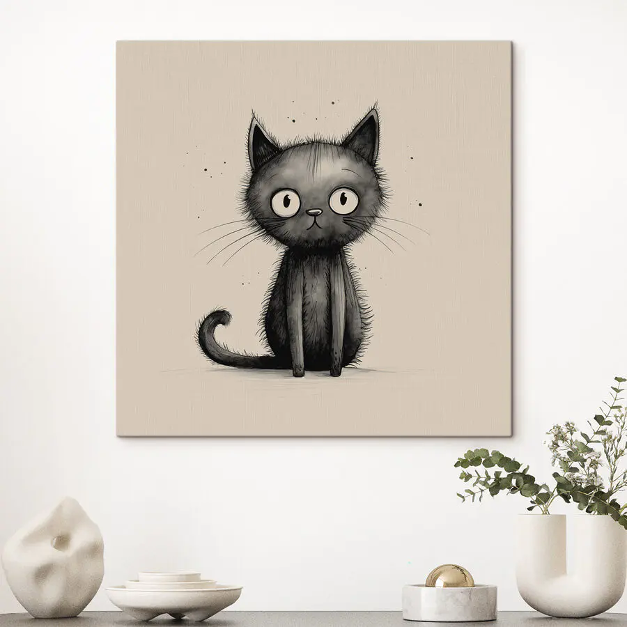 Der Leinwanddruck “Schwarze Katze mit großen Augen” ist ein skurriler Blickfang für jeden Raum. Diese charmante kleine Katze scheint Sie mit ihrem übertriebenen Blick in eine Welt voller Geheimnisse und Neugierde einzuladen. Sie eignet sich perfekt für eine gemütliche Ecke oder sogar für die leere Wand, die Sie schon seit Ewigkeiten anstarren. Es ist, als hätten Sie einen freundlichen Begleiter, der Ihre Pflanzen nicht umwirft.