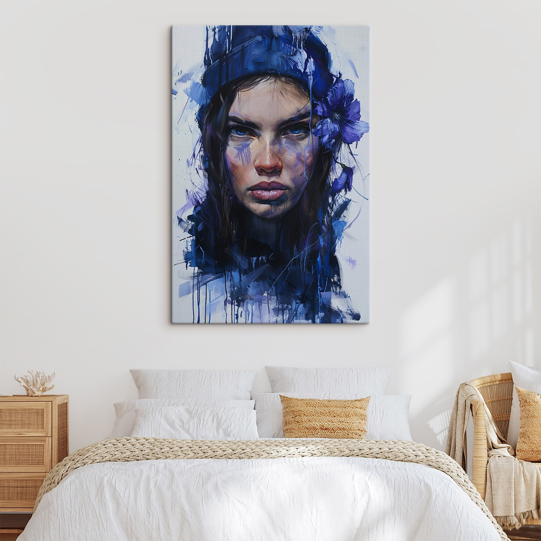 Dieser Leinwanddruck, der eine auffällige Frau mit wunderschönen blauen Blumen im Haar zeigt, ist der perfekte Gesprächsanlass. Stellen Sie sich vor, Sie betreten einen Raum und werden von ihrem intensiven Blick begrüßt – es ist, als ob sie alle Ihre Geheimnisse kennt! Die satten Blautöne und die leuchtenden Blütenblätter schaffen eine Atmosphäre, die sowohl beruhigend als auch anregend wirkt und gut zu Ihrer Einrichtung passt. Hängen Sie es in einer gemütlichen Ecke oder über Ihrer Couch auf, und beobachten Sie, wie es die Blicke auf sich zieht und die Fantasie anregt. Es ist nicht einfach nur Wandkunst, sondern eine Einladung zum Träumen, zum Erforschen von Emotionen und zum Schätzen einzigartiger Schönheit. Jeder Blick auf dieses Werk kann eine kleine Freude oder eine Erinnerung auslösen. Wer würde sich das nicht wünschen?