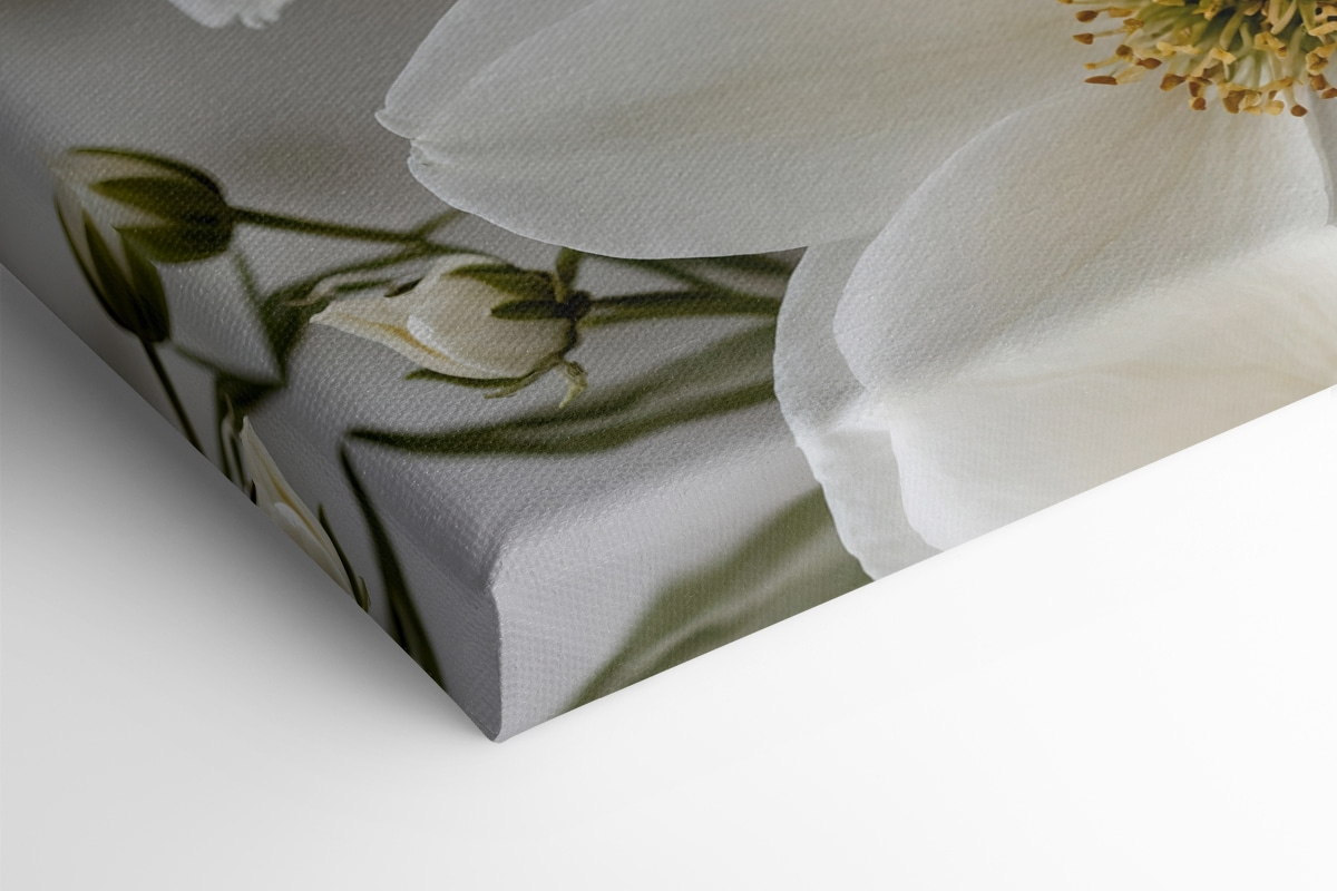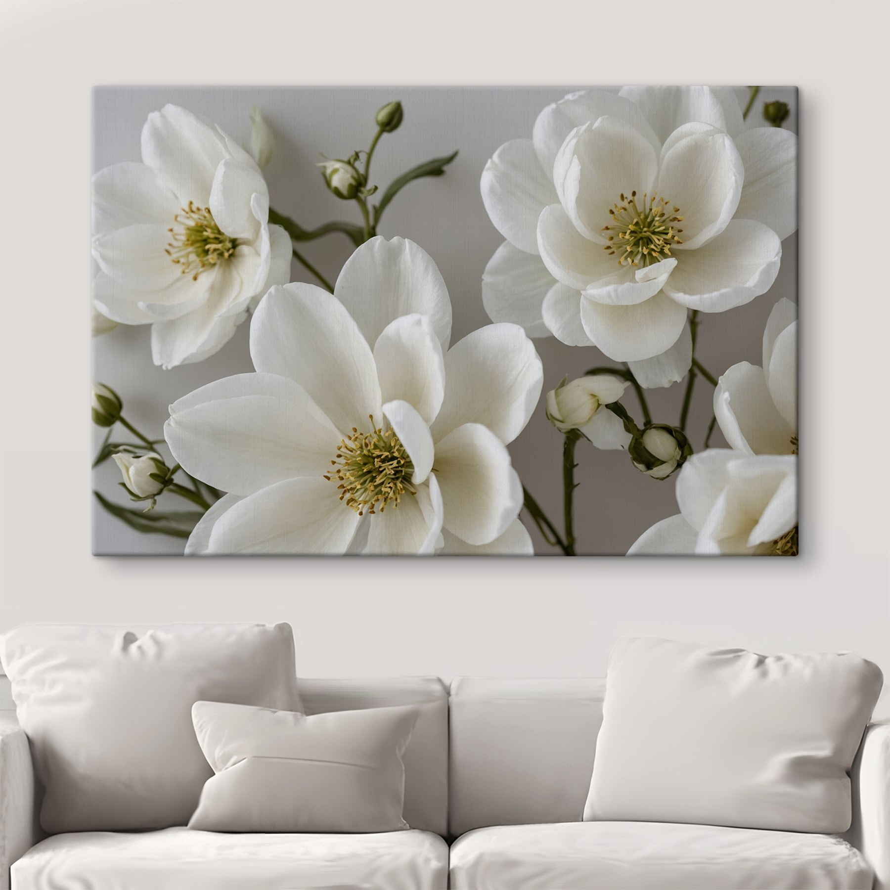 Verschönern Sie Ihren Raum mit diesem atemberaubenden “Wandbilder Group of White Flowers”. Stellen Sie sich vor, Sie betreten einen Raum und werden von diesen eleganten Blüten begrüßt – so frisch, dass sie sich in einer leichten Brise wiegen könnten. Die zarten Blütenblätter und das zarte Grün fangen die Essenz der Natur ein, ohne dass man dafür ins Freie gehen muss. Sie eignet sich perfekt für eine gemütliche Leseecke oder ein minimalistisches Wohnzimmer und verleiht ihm einen Hauch von Charme und Ruhe. Stellen Sie sich vor, Sie machen es sich mit einer Tasse Tee gemütlich, betrachten diese schönen Blumen und fühlen eine Welle der Ruhe über sich hereinbrechen. Wer hätte gedacht, dass eine Leinwand eine solche Stimmung auslösen kann?