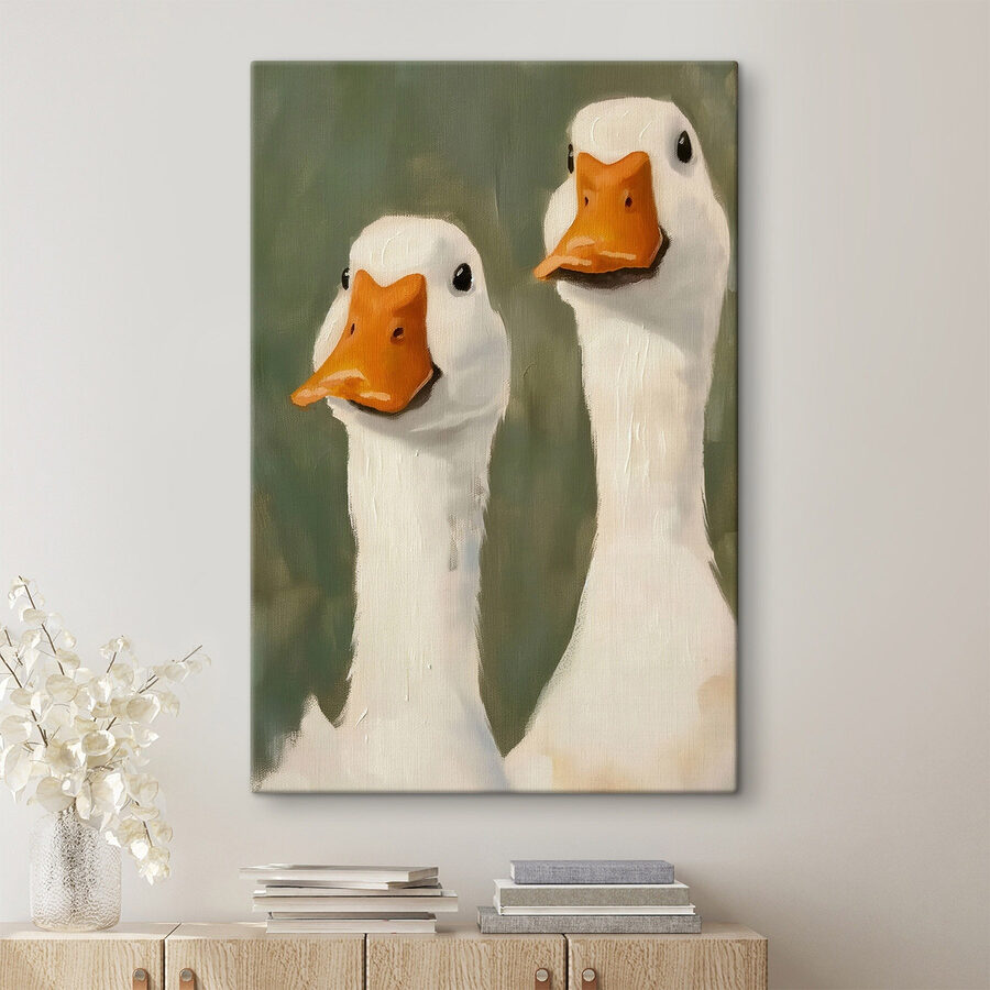Bringen Sie einen Hauch von Laune in Ihren Raum mit diesem entzückenden Leinwanddruck mit zwei charmanten weißen Enten – denn wer hätte nicht gerne ein paar gefiederte Freunde um sich? Die leuchtenden Farben und verspielten Ausdrücke bringen Leben an jede Wand und schaffen eine fröhliche Atmosphäre, die perfekt für ein Wohnzimmer, ein Kinderzimmer oder eine gemütliche Essecke ist. Stellen Sie sich vor, Sie trinken einen Kaffee und plaudern mit diesen niedlichen Vögeln. Sie haben bestimmt eine Menge Geschichten zu erzählen, wie zum Beispiel die, als sie im Winter fast in den Süden geflogen sind. Sie sind nicht nur Kunst, sondern sorgen für Gesprächsstoff, der Ihr Zuhause warm und einladend macht.