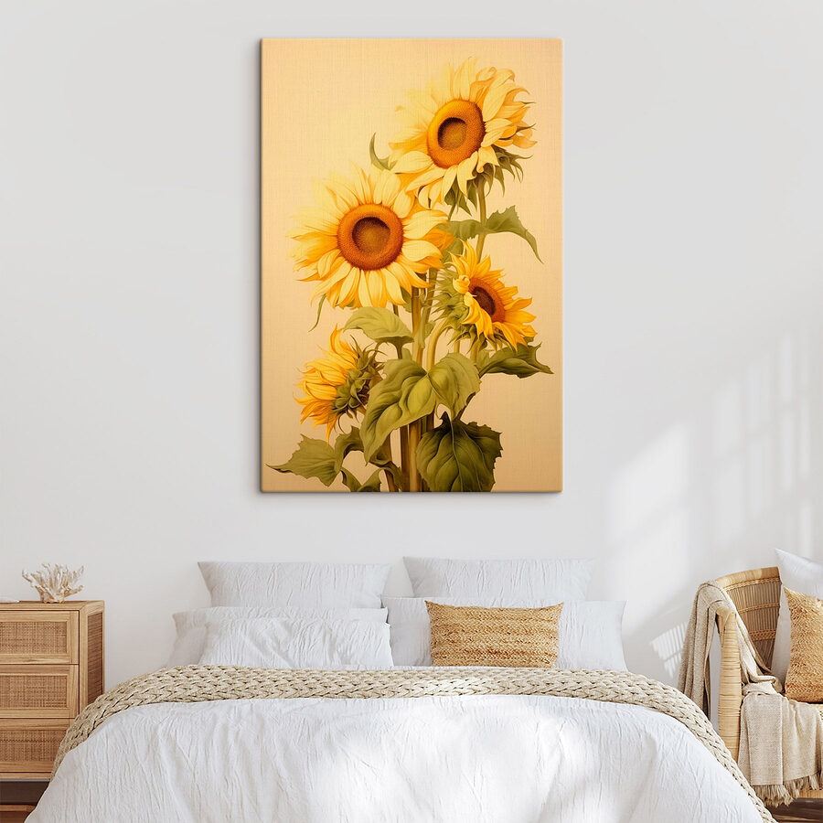 Dieser atemberaubende Leinwanddruck mit Sonnenblumen vor einem sanften weißen Hintergrund bringt jeden Raum zum Strahlen. Ein echter Stimmungsaufheller! Die leuchtenden Gelb- und Grüntöne verbreiten eine fröhliche Stimmung, die Sie in einen sonnigen Garten versetzt, selbst wenn es draußen schüttet. Stellen Sie sich vor, Sie gehen an diesem Stück vorbei – es ist wie ein kleiner Ausbruch von Freude, perfekt für eine leere Wand im Wohnzimmer oder eine gemütliche Ecke, in der Sie es sich mit einem Buch gemütlich machen. Und wer kann schon dem Charme von Sonnenblumen widerstehen? Sie scheinen direkt auf Sie zurückzulächeln. Bringen Sie einen Hauch von Natur in Ihre Einrichtung und lassen Sie sich von der Sonne anstecken!