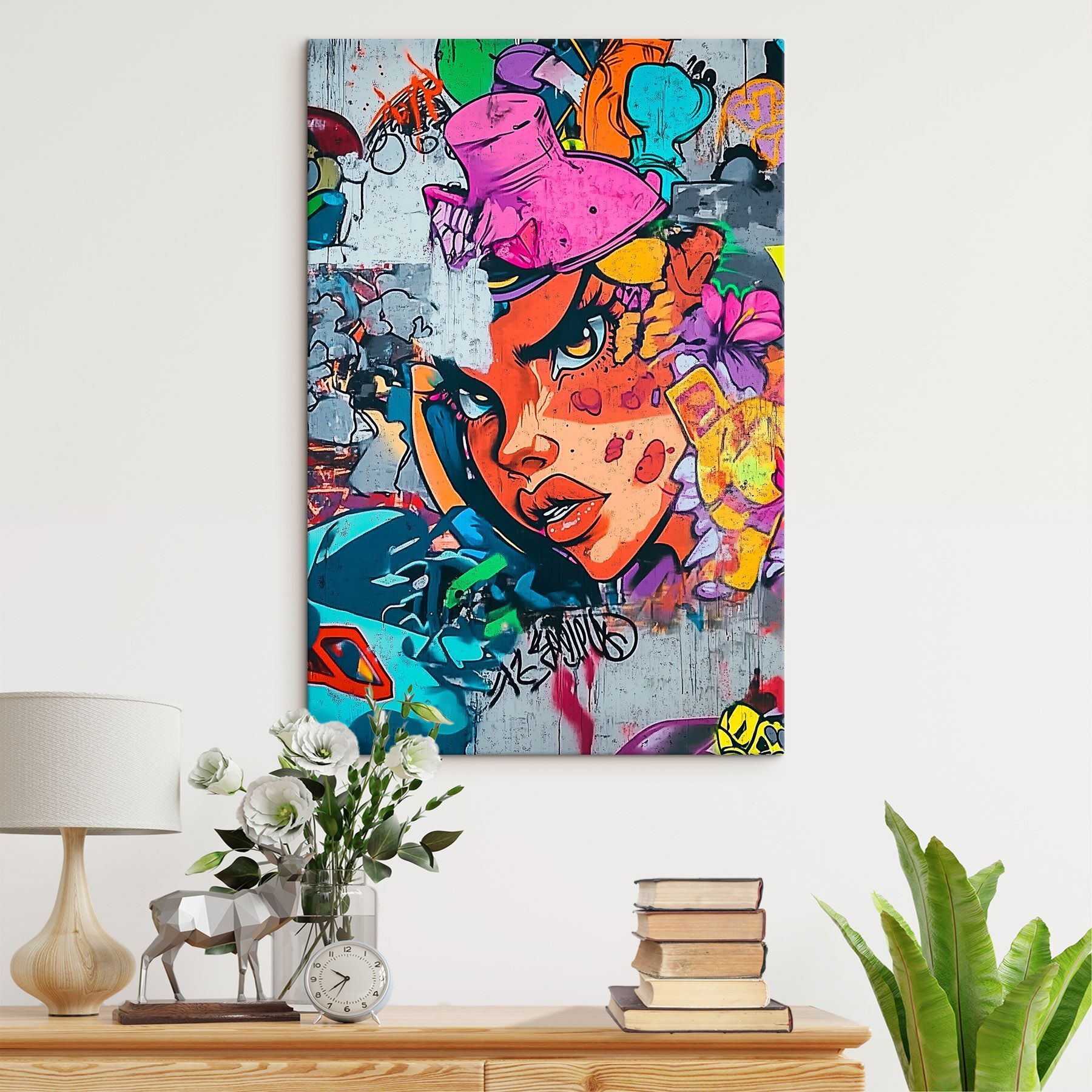 Erhellen Sie jeden Raum mit diesem fesselnden “Wandbilder Graffiti on a Wall”. Die leuchtenden Farben und eindrucksvollen Bilder erzählen Geschichten, von denen Sie nicht einmal wussten, dass sie erzählt werden müssen. Stellen Sie sich vor, Sie betreten einen Raum und werden von einem Energieschub begrüßt – es ist, als ob Sie eine Party feiern, ohne aufräumen zu müssen. Dieses Kunstwerk sorgt für eine lebendige, urbane Atmosphäre, die langweilige Wände in einen Gesprächsanlass verwandelt. Es eignet sich perfekt für eine gemütliche Ecke oder ein lebhaftes Wohnzimmer, weckt die Neugierde und verleiht einen Hauch von Street-Smart-Flair. Und wer hätte nicht gern einen Farbtupfer, der praktisch einen eigenen Soundtrack mitbringt? Machen Sie sich bereit, den Vibe zu genießen!