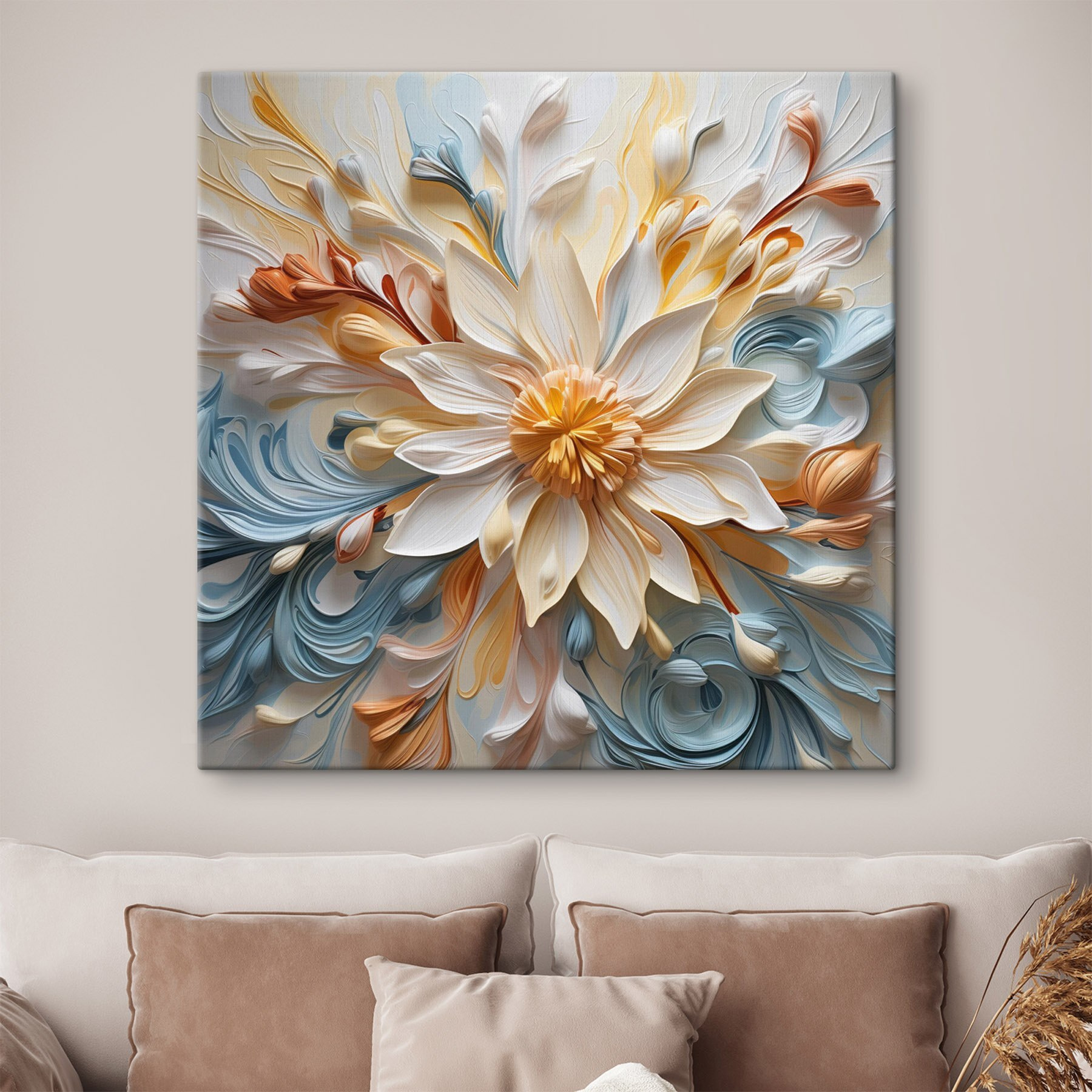 Bringen Sie Leben in jeden Raum mit diesem atemberaubenden “Canvas Print Flower Made Out of Paper”. Es ist nicht nur Kunst, sondern auch eine entzückende Explosion von Blüten, die die Gäste zum Staunen bringen wird. Die Farben tanzen auf der Leinwand – sanfte Blautöne, warme Gelbtöne und cremiges Weiß – und schaffen eine Atmosphäre, die sowohl frisch als auch gemütlich ist. Stellen Sie sich diese Schönheit über einer Couch hängend vor, so dass jedes Kaffeekränzchen wie eine kleine Gartenparty wirkt. Die verspielte Textur und die raffinierten Details sorgen für ein bisschen Laune und Freude. Es ist, als hätten Natur und Kreativität ein charmantes kleines Rendezvous direkt in Ihrem Wohnzimmer. Perfekt für alle, die einen Hauch von Unerwartetem lieben!