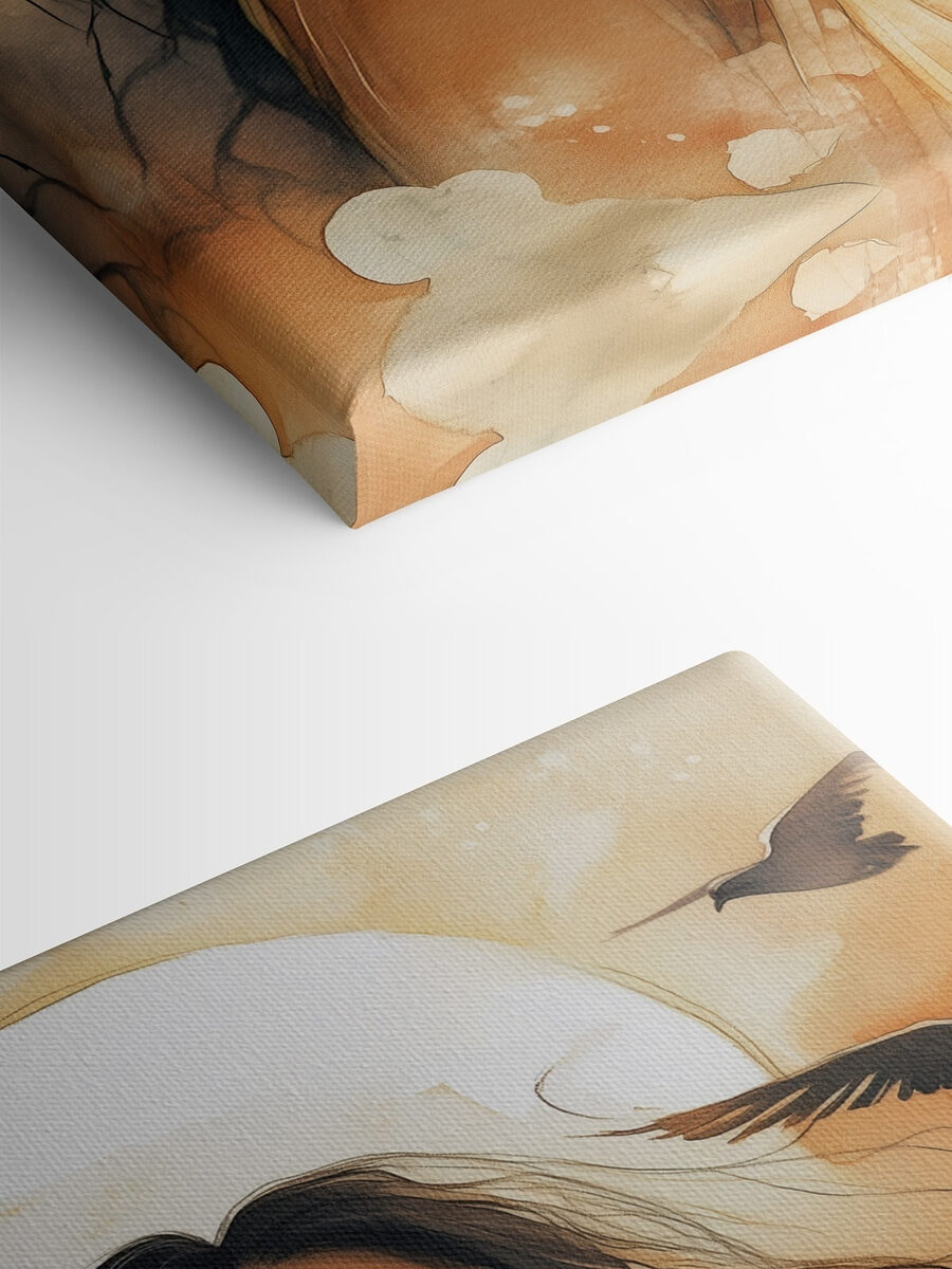 Gestalten Sie Ihren Raum mit diesem atemberaubenden Leinwandbild, das eine Frau mit wallendem Haar und Vögeln im Himmel zeigt. Es ist wie ein Traum – in einem Moment steht sie stolz da, im nächsten lässt sie sich von der Brise die Sorgen wegtragen. Perfekt für alle, die sich nach einem Hauch von Natur mit einem Hauch von gefühlvollem Charme sehnen, wird dieses Stück Gespräche und vielleicht ein paar Tagträume anregen. Hängen Sie es in eine gemütliche Ecke oder über ein stilvolles Sofa und beobachten Sie, wie es jedem Raum Leben einhaucht. Wer wünscht sich nicht ein wenig Magie in seinem Zuhause?