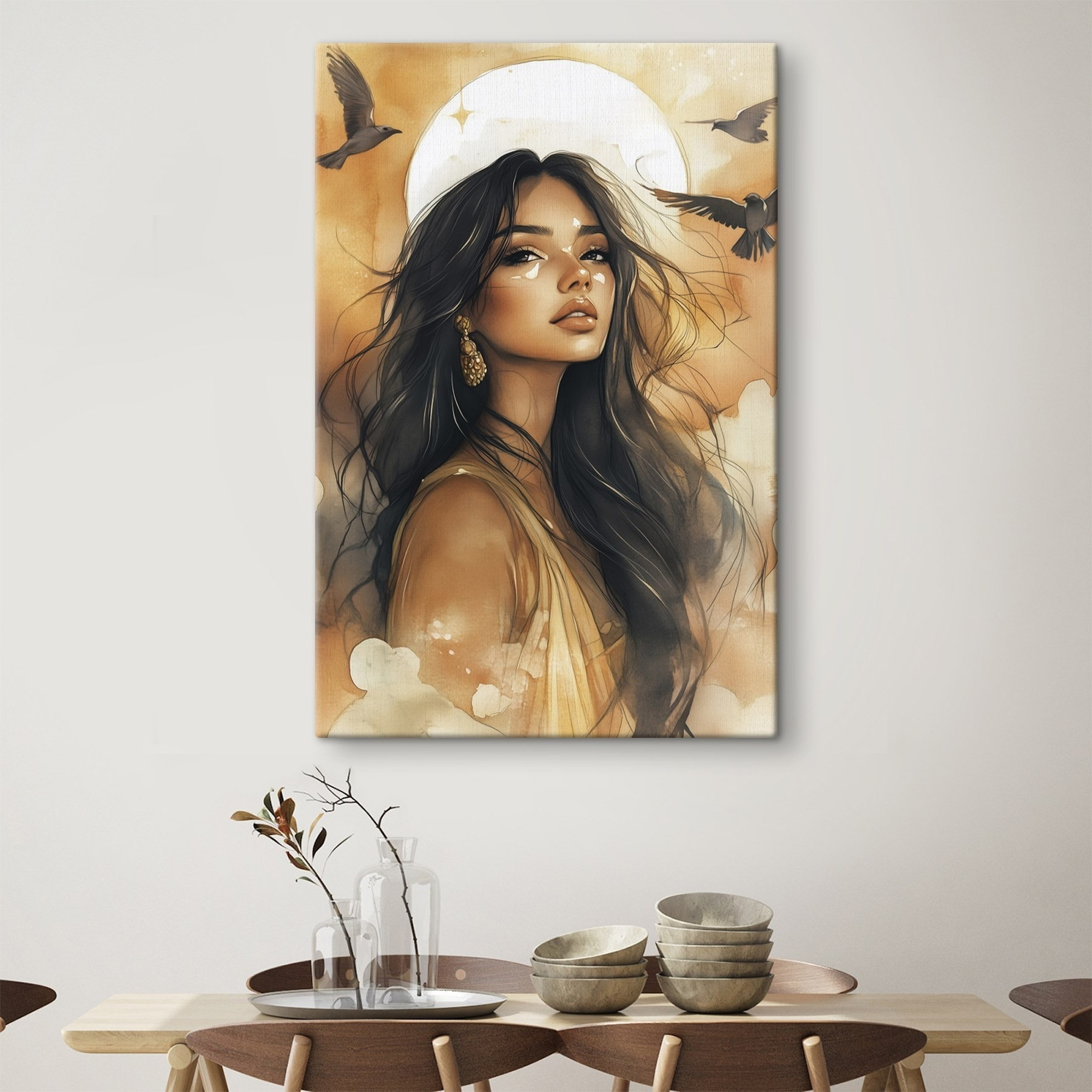 Gestalten Sie Ihren Raum mit diesem atemberaubenden Leinwandbild, das eine Frau mit wallendem Haar und Vögeln im Himmel zeigt. Es ist wie ein Traum – in einem Moment steht sie stolz da, im nächsten lässt sie sich von der Brise die Sorgen wegtragen. Perfekt für alle, die sich nach einem Hauch von Natur mit einem Hauch von gefühlvollem Charme sehnen, wird dieses Stück Gespräche und vielleicht ein paar Tagträume anregen. Hängen Sie es in eine gemütliche Ecke oder über ein stilvolles Sofa und beobachten Sie, wie es jedem Raum Leben einhaucht. Wer wünscht sich nicht ein wenig Magie in seinem Zuhause?