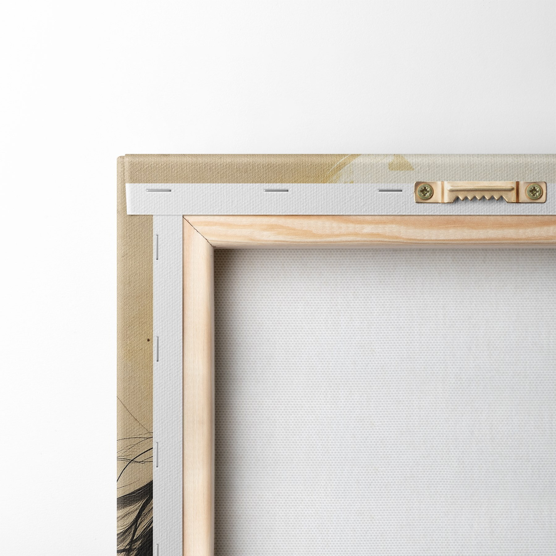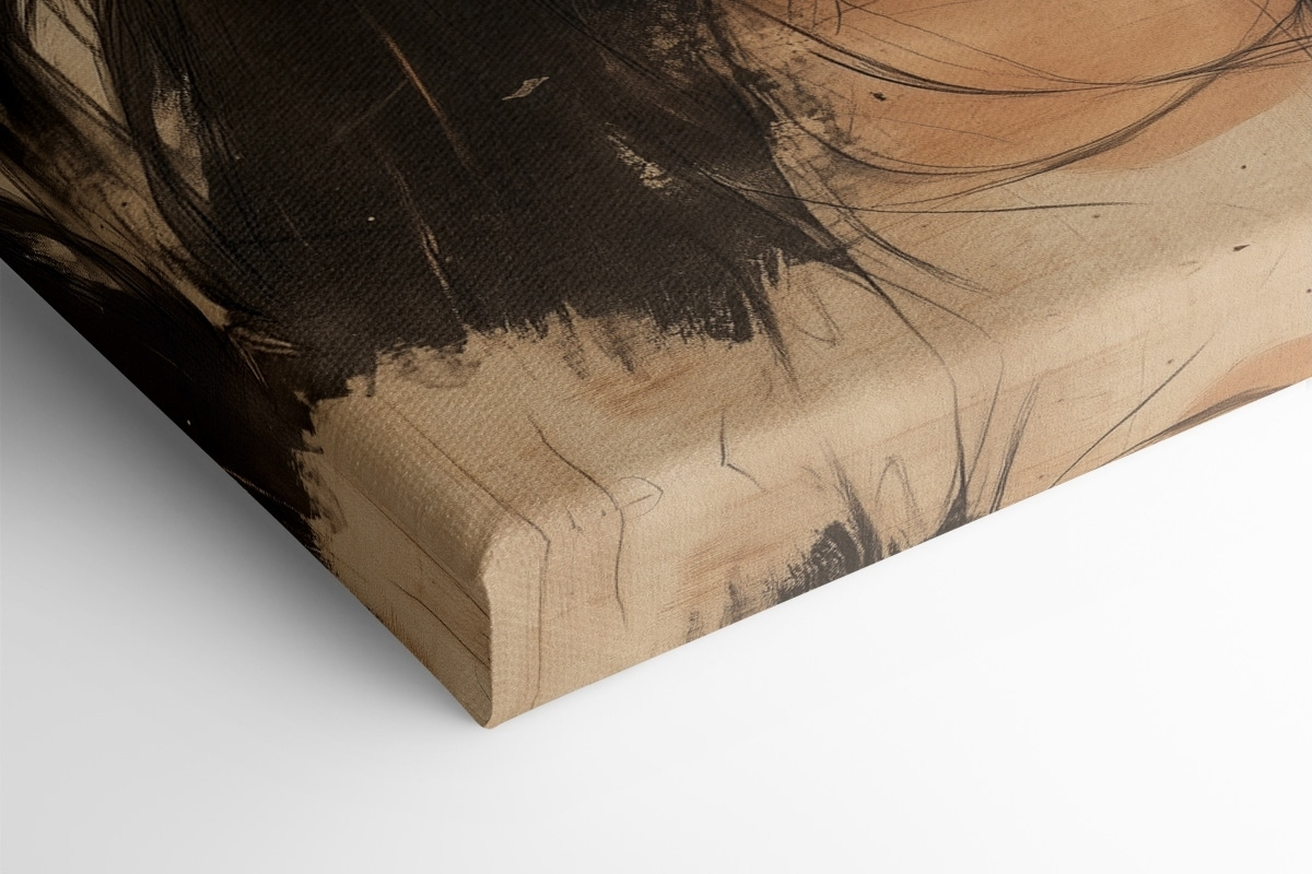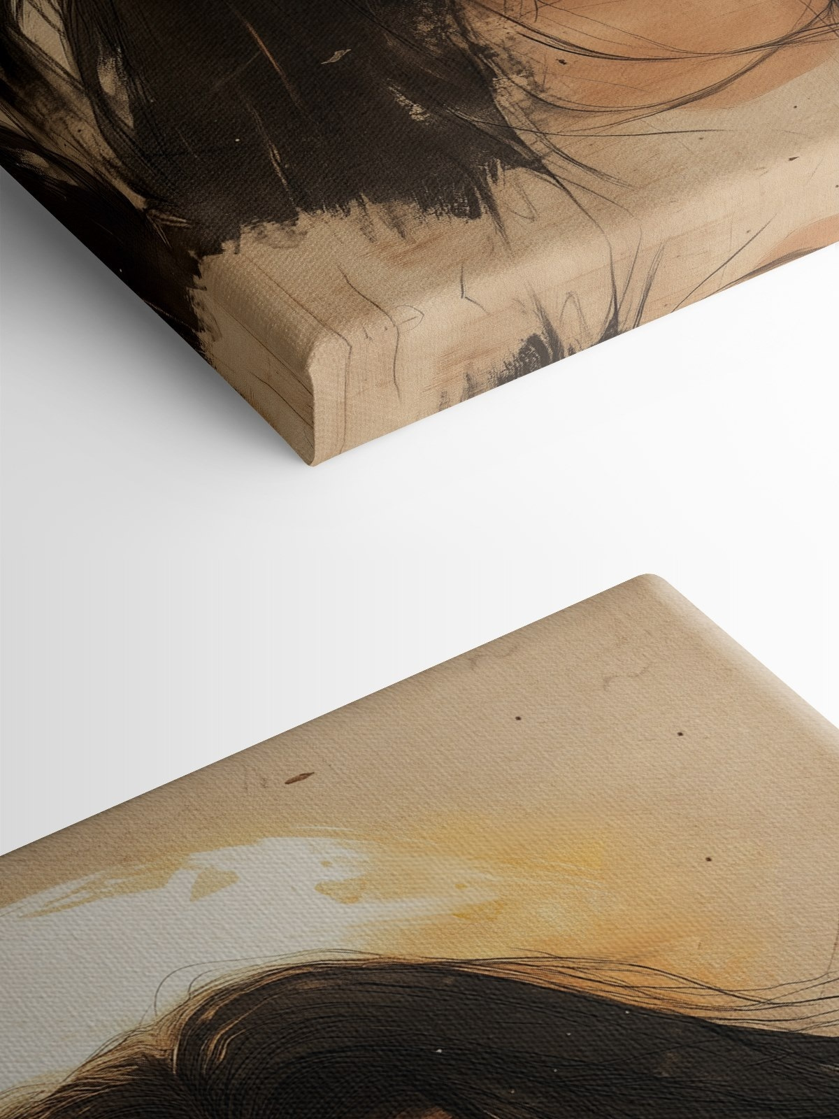 Dieser Leinwanddruck zeigt eine auffällige Frau mit langen schwarzen Haaren, die wie in einer sanften Brise tanzen. Ihr ruhiger Ausdruck lädt den Betrachter zu einem Moment der Besinnung und Ruhe ein. Stellen Sie sich vor, dass dieses Bild in einem gemütlichen Wohnzimmer oder einem ruhigen Schlafzimmer hängt und sofort eine warme und einladende Atmosphäre schafft. Es flüstert Geschichten vom Fernweh und erinnert uns daran, bei einer Tasse Kaffee über die Geheimnisse des Lebens nachzudenken oder sich in einem guten Buch zu verlieren. Die erdigen Töne passen wunderbar zu jedem Einrichtungsstil und sorgen für einen Hauch von künstlerischer Ablenkung. Perfekt für alle, die eine Mischung aus Schlichtheit und Tiefe schätzen. Ein Stück, das zu Gesprächen anregt, selbst wenn man es nur mit sich selbst tut.