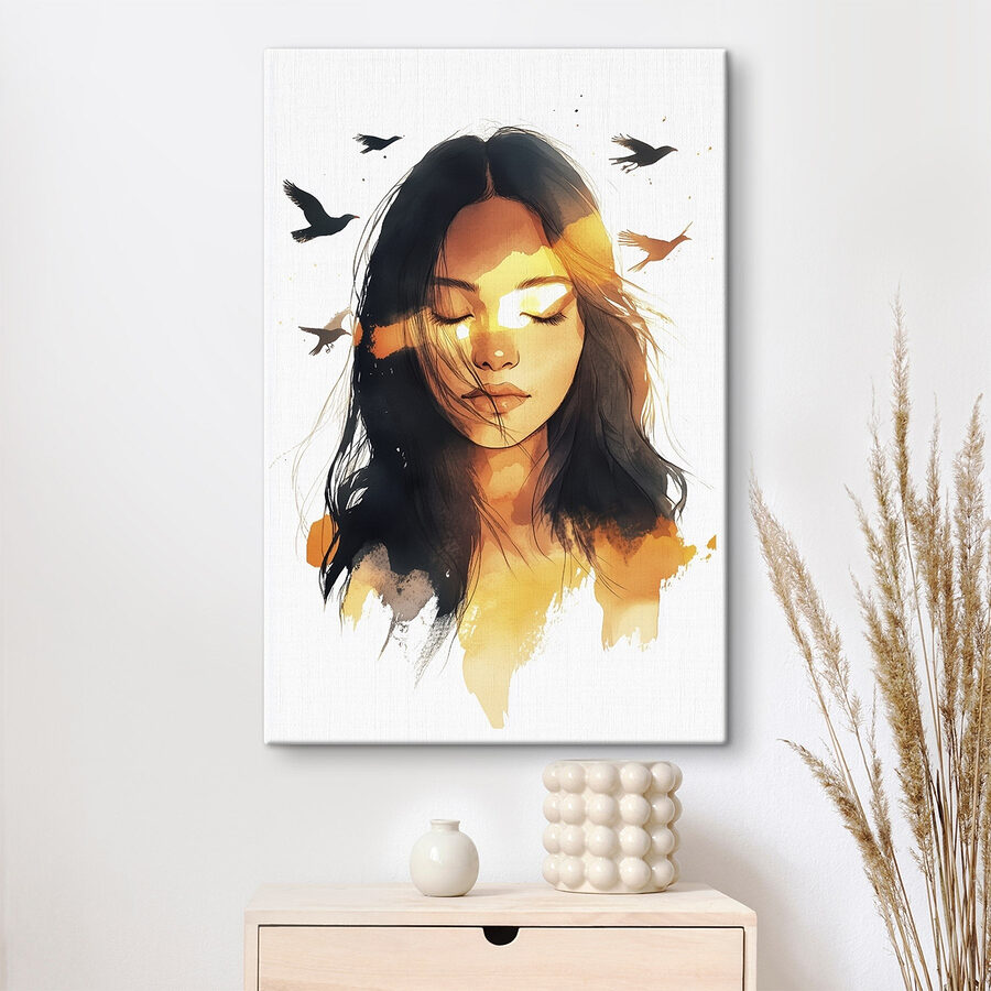 Verwandeln Sie jede Wand in einen verträumten Rückzugsort mit “Mysterious Beauty in Warm Hues”. Dieser Leinwanddruck zeigt eine bezaubernde Figur, die von einem Farbspritzer umgeben ist, der an einen Sonnenuntergang erinnert und Gefühle von Ruhe und Inspiration hervorruft. Stellen Sie sich vor, Sie kommen nach Hause zu diesem Kunstwerk – es zieht Sie an wie ein gemütliches Lagerfeuer und lädt Sie ein, sich nach einem langen Tag zu entspannen. Die sanfte Mischung aus warmen Tönen erhellt nicht nur den Raum, sondern regt auch zu Gesprächen an. Es ist perfekt für ruhige Momente der Besinnung oder wenn Freunde vorbeikommen. Perfekt ausbalanciert, flüstert es Eleganz, ohne zu laut zu sein. Wer hätte gedacht, dass eine Leinwand so beruhigend sein kann?